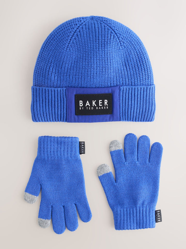 Keep him warm and stylish with the Baker by Ted Baker Boys' Beanie and Gloves Set. This classic blue set includes a ribbed beanie and matching gloves, each finished with signature Baker branded trims. The gloves are designed with a touchscreen-sensitive thumb and index finger, so he can stay connected without taking them off. This set is the perfect accessory to pair with his favourite Baker by Ted Baker coat, ensuring he stays cosy and on-trend all season long. Beanie and gloves set Baker branded trims Touchscreen sensitive tips Hat Main 50% LENZING™ ECOVERO™ Viscose, 30% Recycled polyester, 20% Nylon. Lining 100% Polyester. Gloves 47% LENZING™ ECOVERO™ Viscose, 30% Recycled polyester, 20% Nylon, 2% Acrylic, 1% Elastane. Country of Origin: China