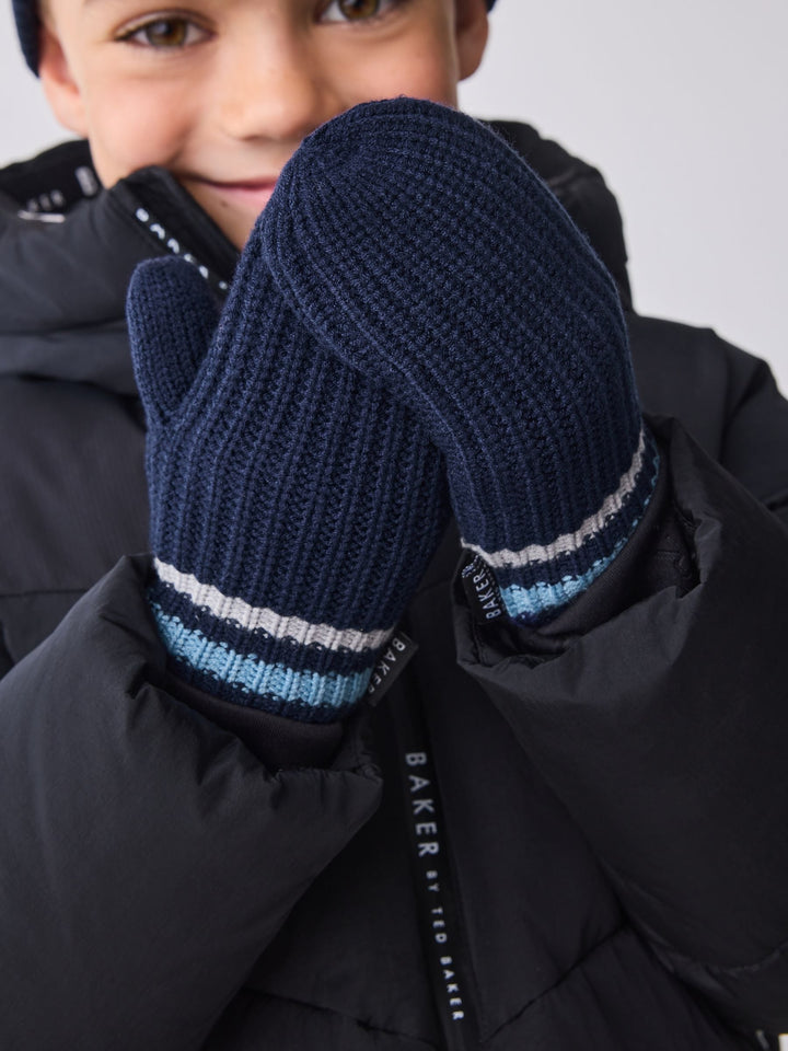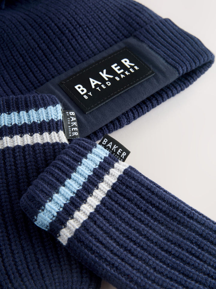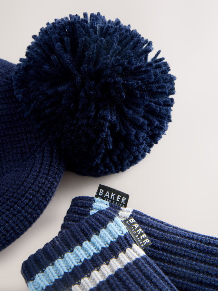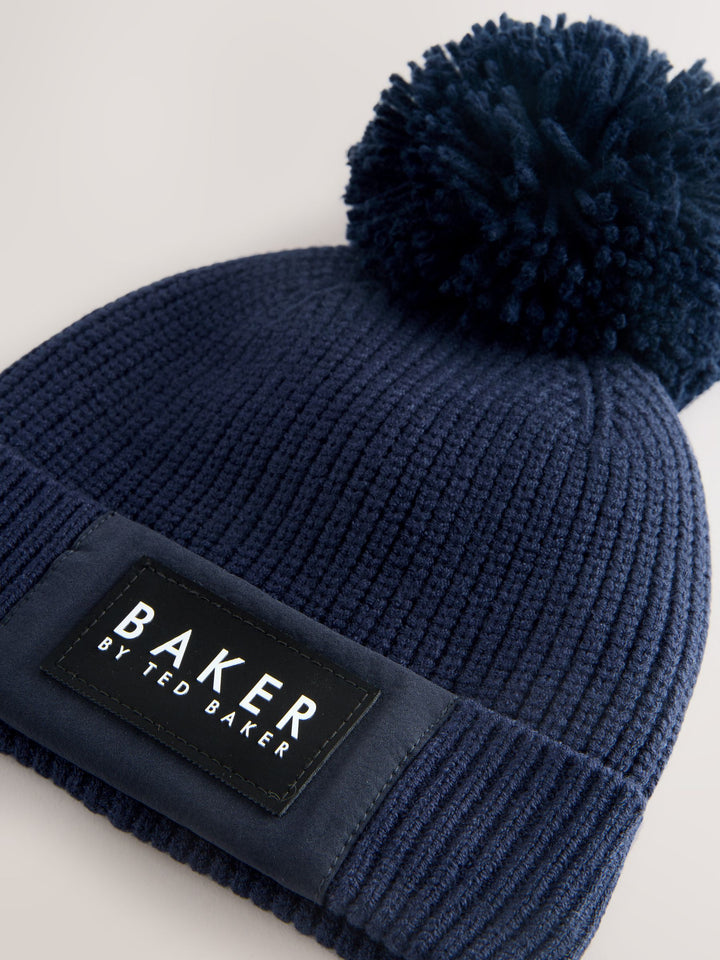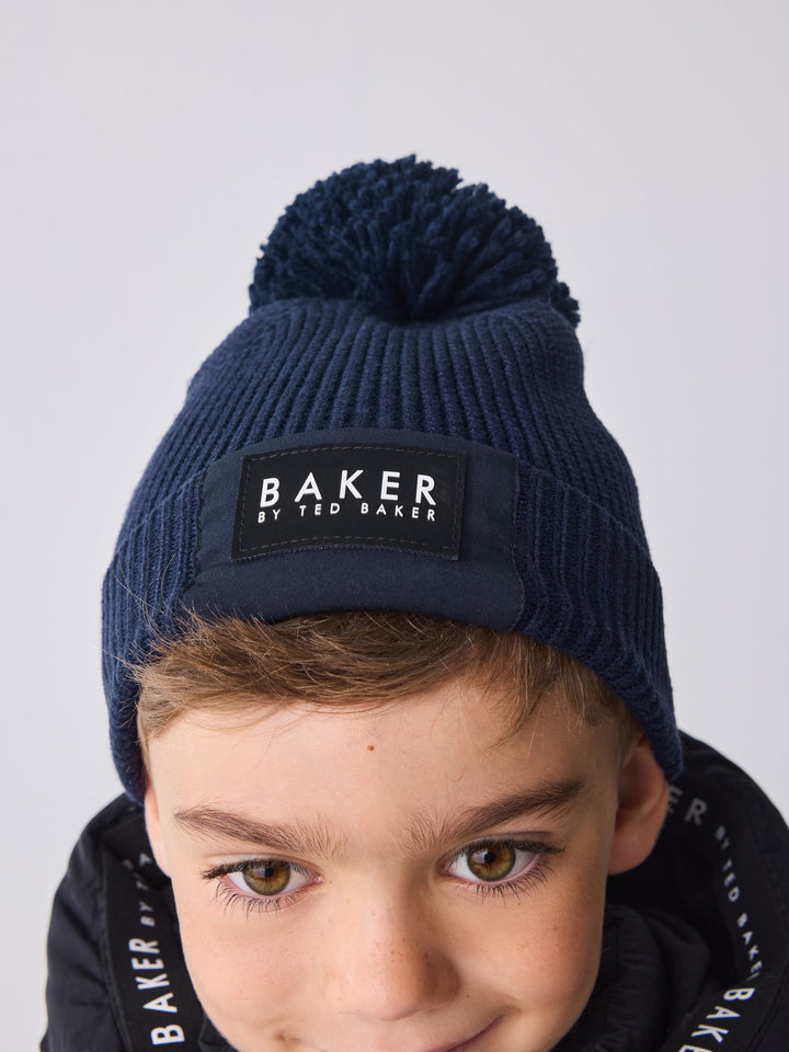 Keep him feeling cosy in the cold weather with the Baker by Ted Baker Boys' Pom Beanie and Mittens Set. This adorable set includes a navy cuffed beanie with a playful pom-pom on top, featuring a striking Baker neoprene logo across the front. It's paired with matching blue mittens that have contrasting cuffs and branded tabs. The hat and mittens both have a soft fleece lining inside to ensure he stays warm and comfortable, while the signature Baker branded trims add a touch of style. This set is the perfect accessory for chilly days. Beanie and mittens set Baker neoprene logo Soft fleece lining Hat and Gloves Main 50% LENZING™ ECOVERO™ Viscose, 30% Recycled polyester, 20% Nylon. Lining 100% Polyester. Country of Origin: China