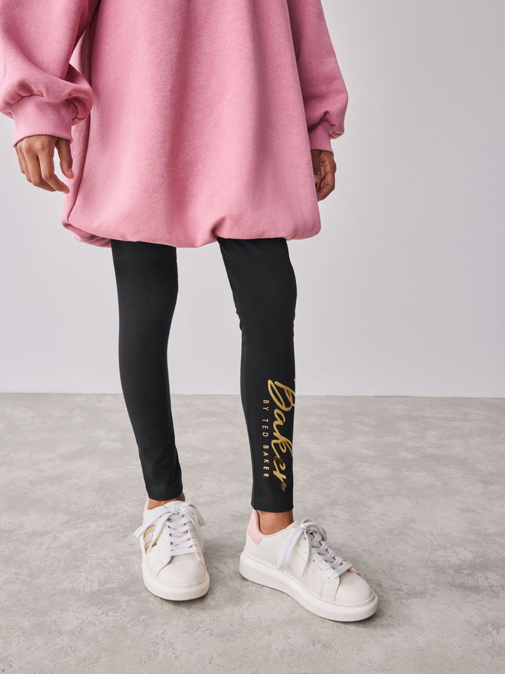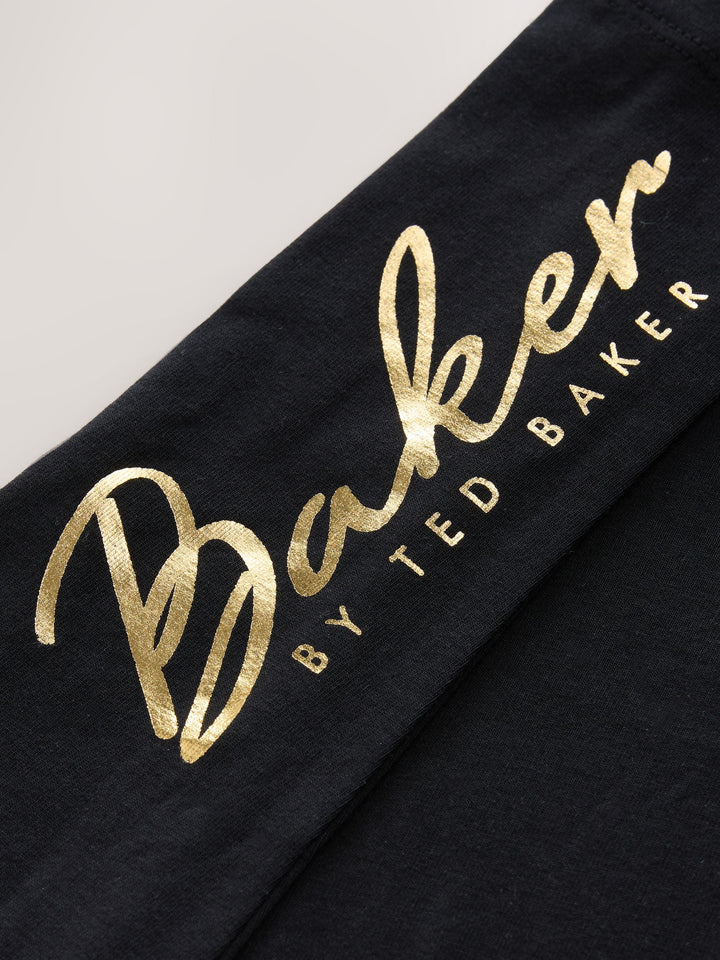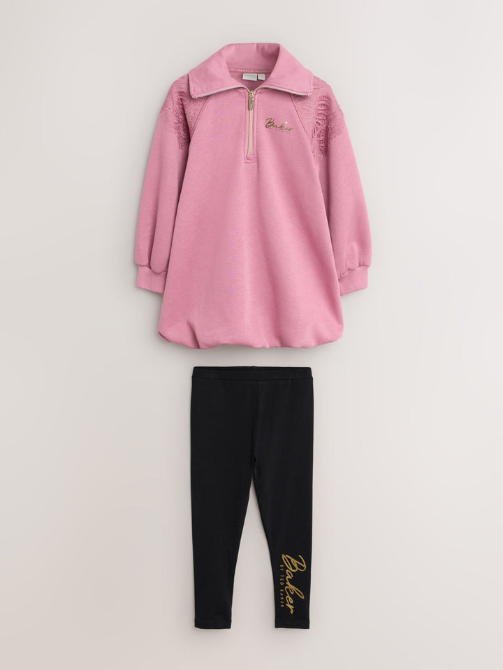 Comfort and style is combined into one with this trendy 2 piece set from Baker by Ted Baker. The set includes a soft brushback longline sweat top, with a bubble hem and lace panel details at the shoulders. Not to mention an adjustable zip neck design with rib details, and gold foil Baker branding on the side of the chest. The leggings include iconic gold foil Baker branding down the side of the leg. Perfect for days out or comfortable days at home. 2 piece set Bubble hem design Foil Baker branding Sweater 55% Cotton, 45% Polyester. Leggings 95% Cotton, 5% Elastane. Country of Origin: United Arab Emirates