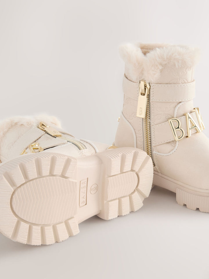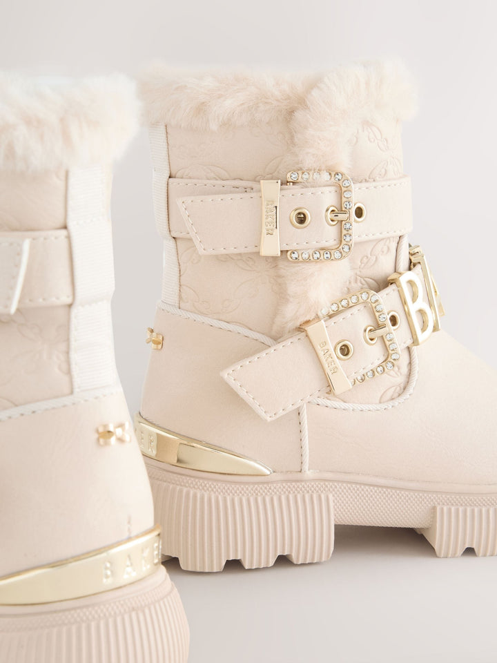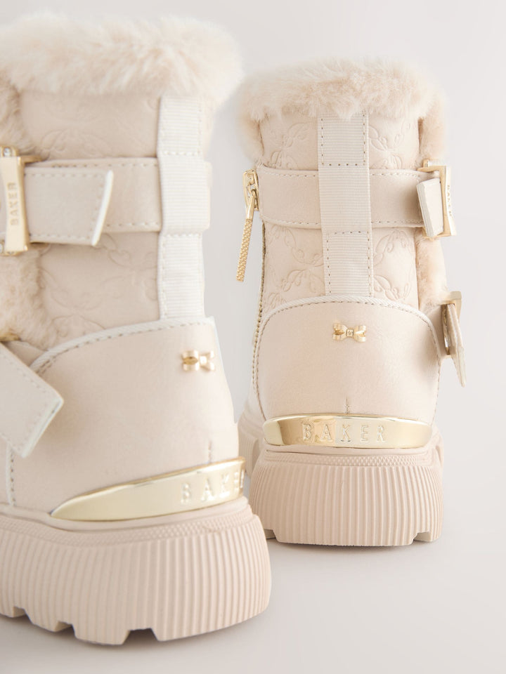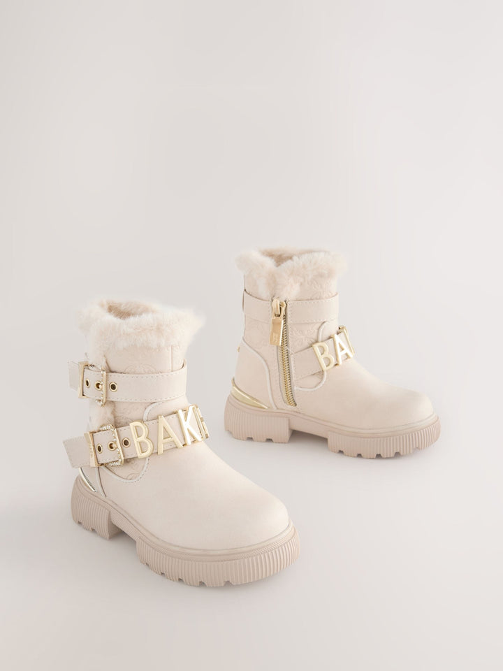Step up her style with the Baker by Ted Baker Girls Buckled Faux Fur Trim Chunky Boots. These fashionable boots feature an elegant embossed detail panel on the side with striking buckled detailing, adorned with shimmering rhinestones to bring a touch of sparkle to every step. Designed for warmth and comfort, they boast a plush faux fur lining and trim, perfect for colder days. With gold Baker branded trims for that signature designer touch and a trendy chunky sole for a confident stride, these boots also include a convenient side zip to help with dressing. Embossed detail Rhinestone buckles Gold Baker branded trims Faux fur lining Side zip Upper - Other Materials, Lining and Sock - Textile, Other Materials, Sole - Other Materials. Country of Origin: China