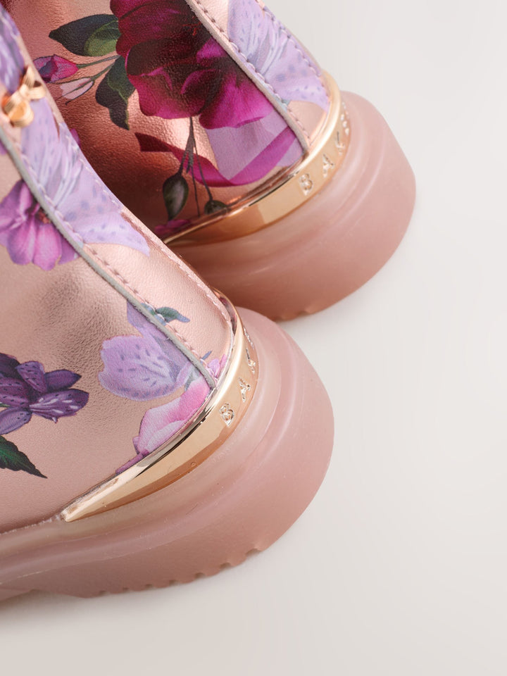 Step into a world of enchanting style with the Baker by Ted Baker Girls Floral Print Lace Up Boots with Bow. These eye-catching boots feature a vibrant metallic pink finish adorned with a charming all-over floral print with bows, making every step a statement. The luxurious pink velvet lace-up detail is elegantly complemented by polka dot tulle bows across the laces and a delightful bow zip puller. Designed for both ease and comfort, they include a convenient side zip and a soft pink faux fur lining to keep her feet warm. Finished with rose gold Baker branded trims, a practical pink gripped sole, and pretty glitter stars on the sole, these boots are a truly magical addition to her wardrobe. All-over floral print Pink velvet lace-up detail Polka dot tulle bows across the laces Rose gold Baker branded trims Pretty glitter stars on the sole Upper - Other Materials, Textile, Lining and Sock - Textile, Other Materials, Sole - Other Materials. Country of Origin: China