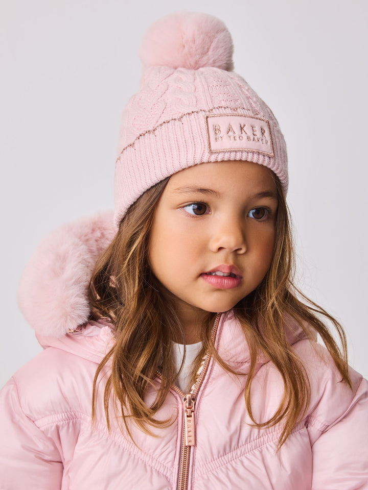 Wrap her up in cosy style with the delightful Baker by Ted Baker Pink Cable Knit Beanie and Mittens Set. The classic pink cable knit beanie features a Baker branded badge at the front, while the matching mittens are finished with delicate bows and Baker branded trims in rose gold. A hint of sparkle is added with rose gold metallic thread woven into a scalloped edge on both the hat and gloves. Complete with a soft pink fleece lining, this set will keep her warm and comfortable on chilly days. 2 piece set Cable knit Branded badge Fleece lined Hat Main 50% LENZING™ ECOVERO™ Viscose, 30% Recycled polyester, 19% Nylon, 1% Metallised fibre. Lining 93% Polyester, 7% Elastane. Artificial Fur 100% Polyester. Mittens Main 50% LENZING™ ECOVERO™ Viscose, 30% Recycled polyester, 19% Nylon, 1% Metallised fibre. Lining 93% Polyester, 7% Elastane. Country of Origin: China