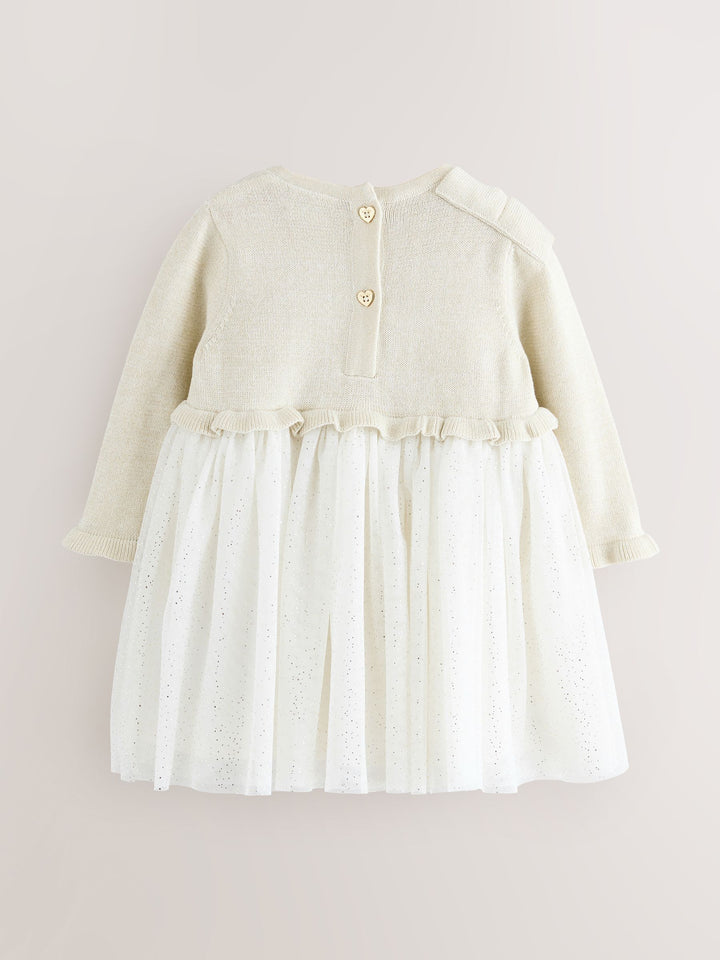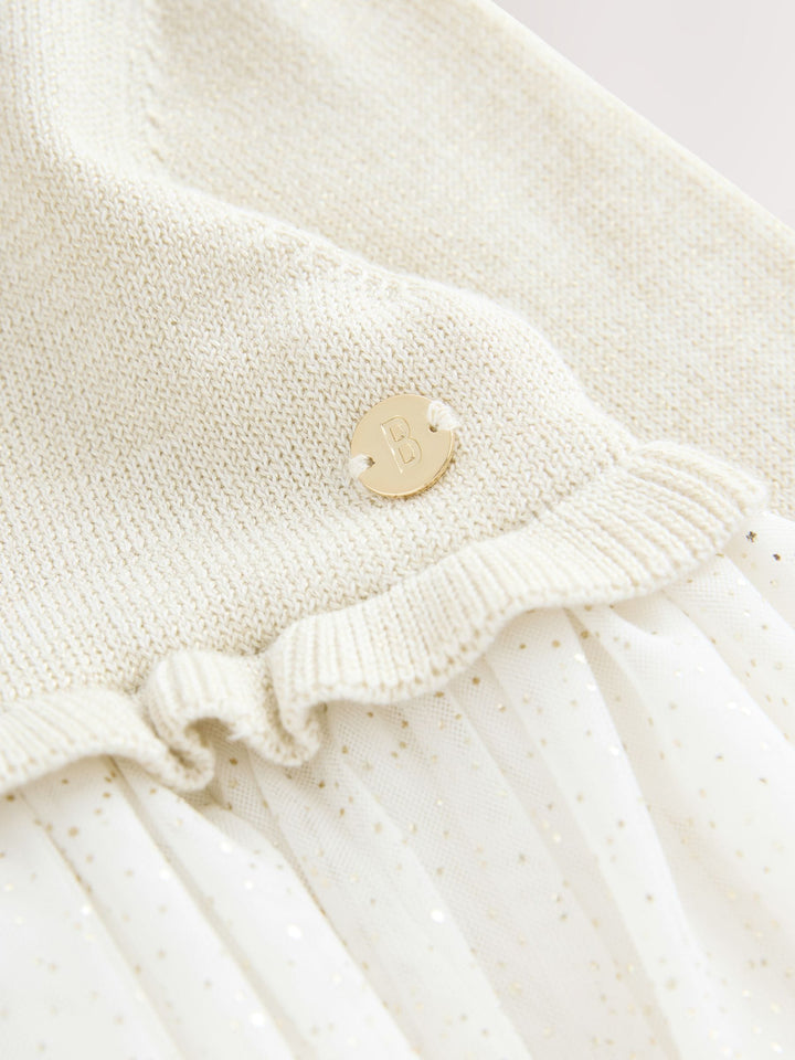 She'll look pretty as a picture in this knitted glittery mockable dress from Baker by Ted Baker. This dress comes in a soft knit fabric mix with a beautiful soft mesh mockable skirt. The dress includes a mock bow feature on the shoulder, and a gold branded decal on the waist. The dress also has gold button closure at the back. Perfect for any time of the year, you can't go wrong with this pretty piece! Main 90% Cotton, 7% Polyester, 3% Metallised fibre. Skirt 100% Polyester. Skirt Lining 100% Polyester. Main Lining 100% Cotton. Country of Origin: India
