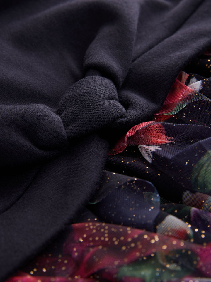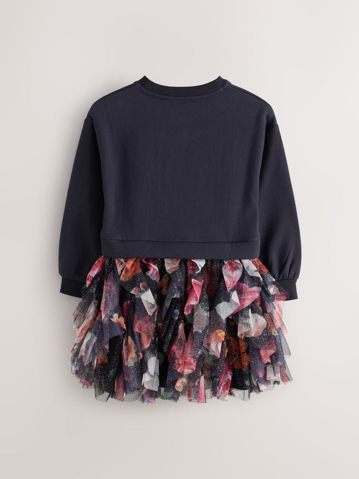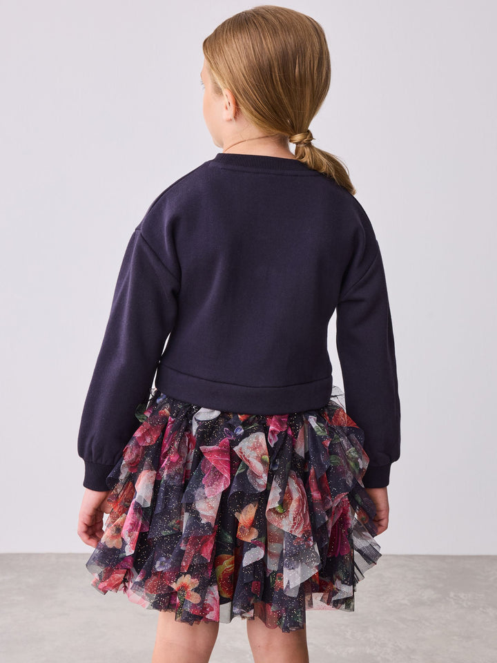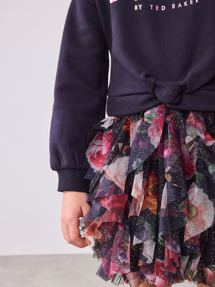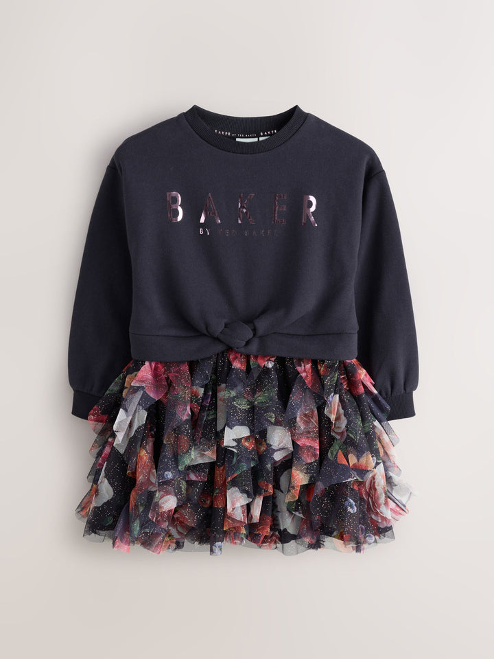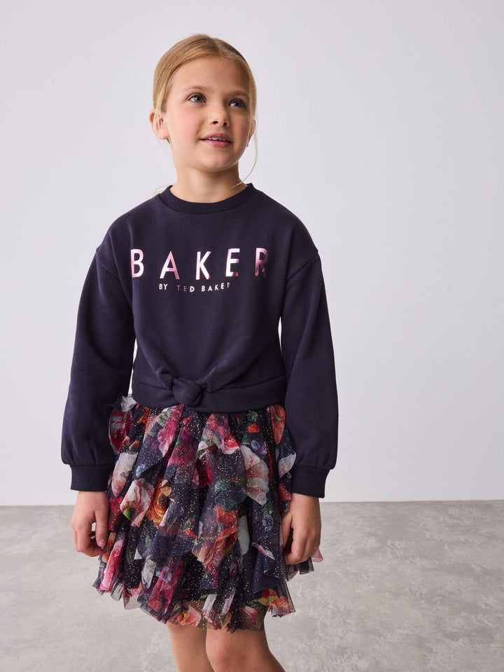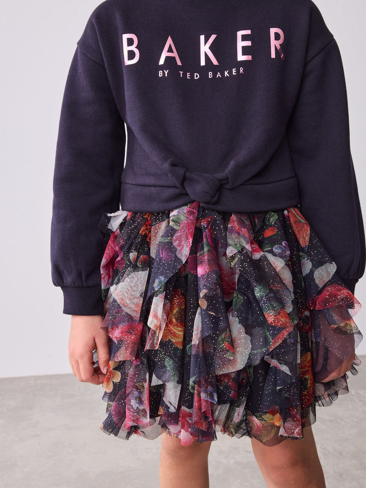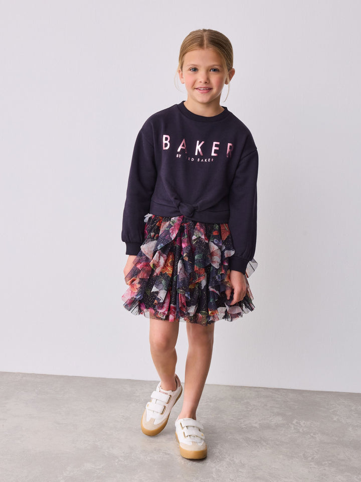 Elevate her winter wardrobe this season with this gorgeous mesh mockable sweat dress from Baker by Ted Baker. This mockable design features a soft brushback cotton body, with a floral tier skirt in a gorgeous speckled mesh. The dress features our iconic Baker branding in foil across the chest. Pair with either boots or trainers for any occasion. Top 53% Cotton, 47% Polyester. Skirt 100% Recycled polyester. Skirt Lining 100% Cotton. Rib 95% Cotton, 5% Elastane. Country of Origin: India