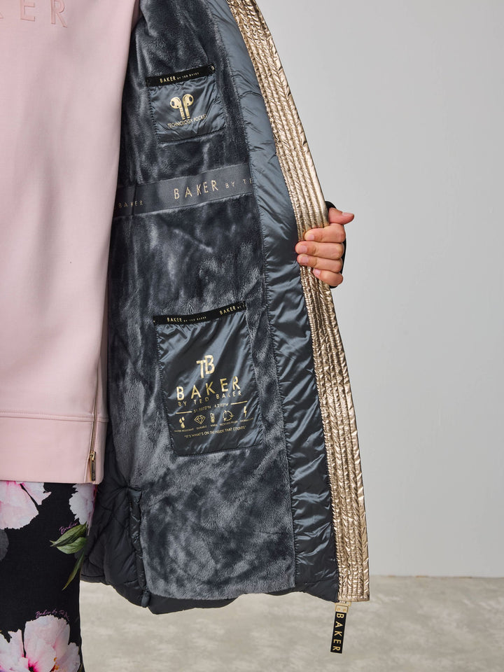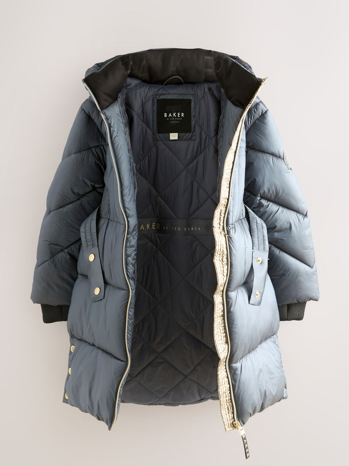 Say no to rainy days in style with this fashionable and functional belted padded coat from Baker by Ted Baker. This pearl navy shower-resistant coat is padded for extra warmth, and comes with a functional removeable belt that features Branded details. The coat features a shirred waist fit, with soft gold hardware including both a central branded zip and popper fastenings on the belt and at the side seams. Finished with neoprene embossed branded storm cuffs, metallic contrast lining, and an internal tech pocket. A perfect versatile addition to her wardrobe. Shell 100% Nylon. Panel 100% Polyester. Outer Lining 100% Polyester. Body Lining 100% Nylon. Cuffs 94% Polyester, 6% Elastane. Wadding 100% Polyester. Country of Origin: China Shower resistant, water repellent finish to provide protection against light rain.