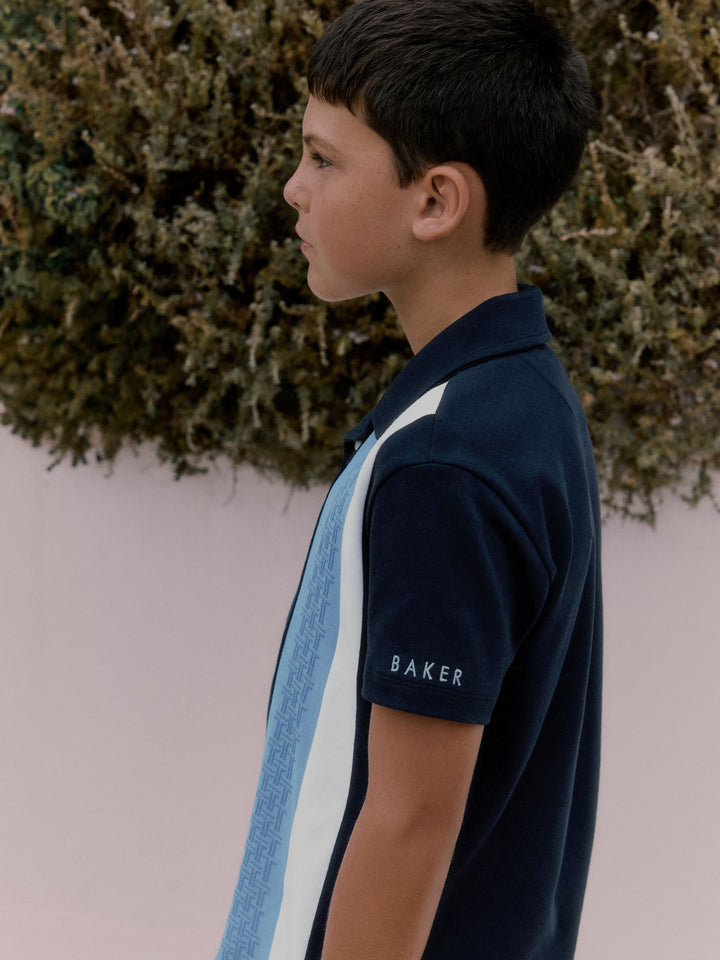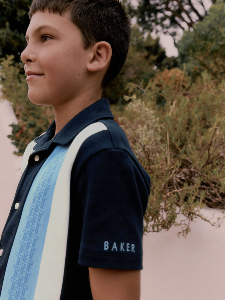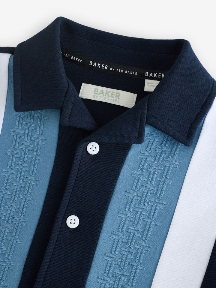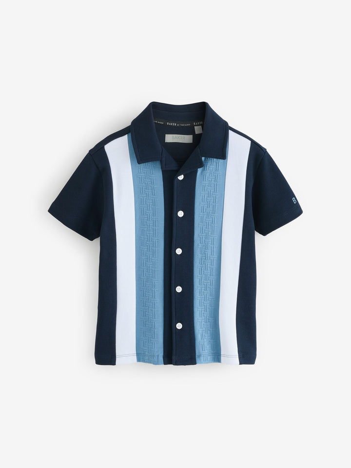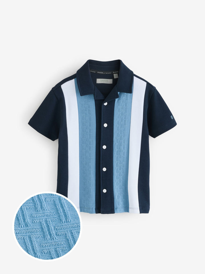 Elevate his casual wardrobe with this smart navy textured stripe shirt from Baker by Ted Baker. Featuring a unique blue 'T' textured panel alongside a contrasting clean white panel, the shirt is finished with white branded buttons and a distinctive blue branded embroidery detail on the sleeve. A smart casual essential for his wardrobe. Textured T panel Branded buttons Branded embroidery on sleeve Main 100% Cotton. Front Panel 93% Cotton, 7% Elastane. Country of Origin: Turkey