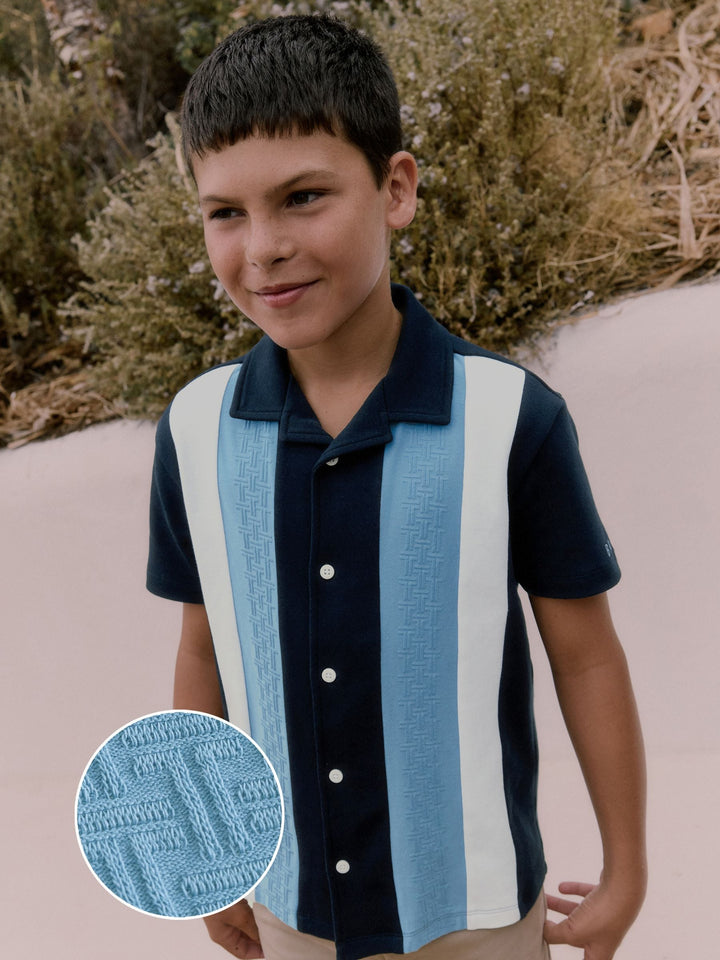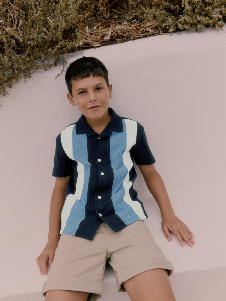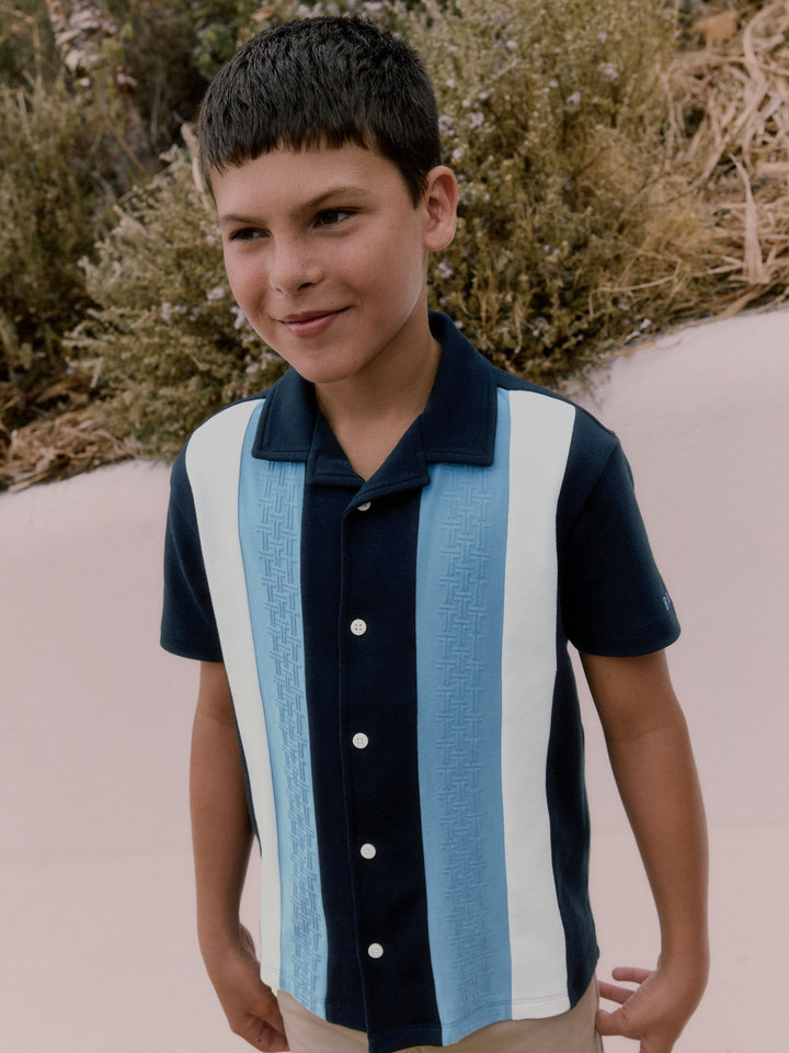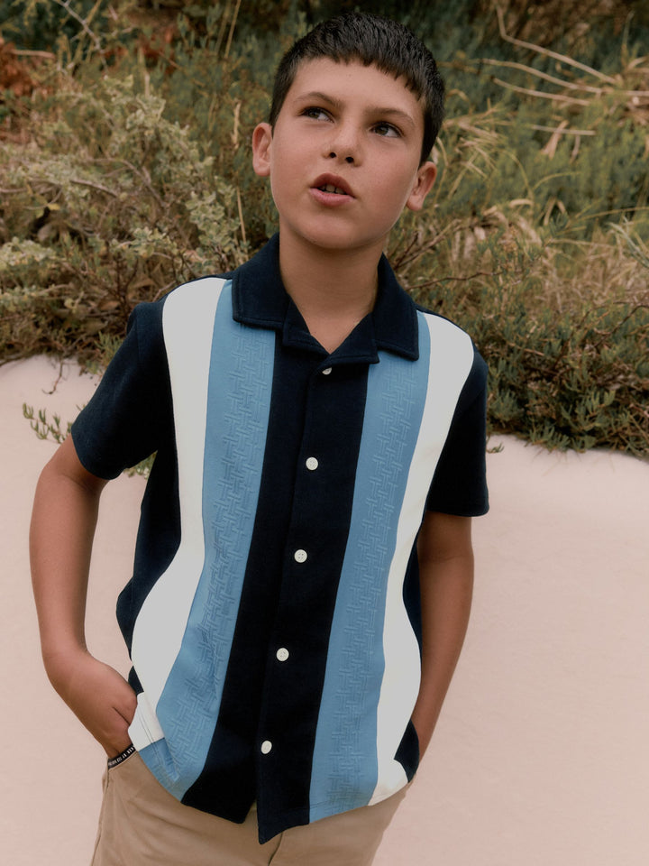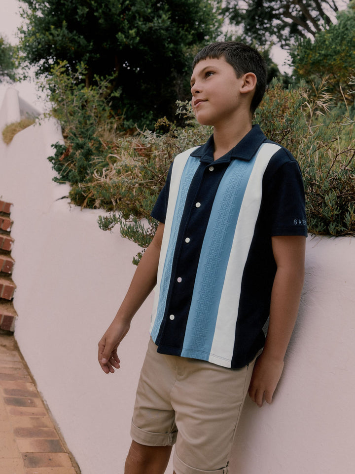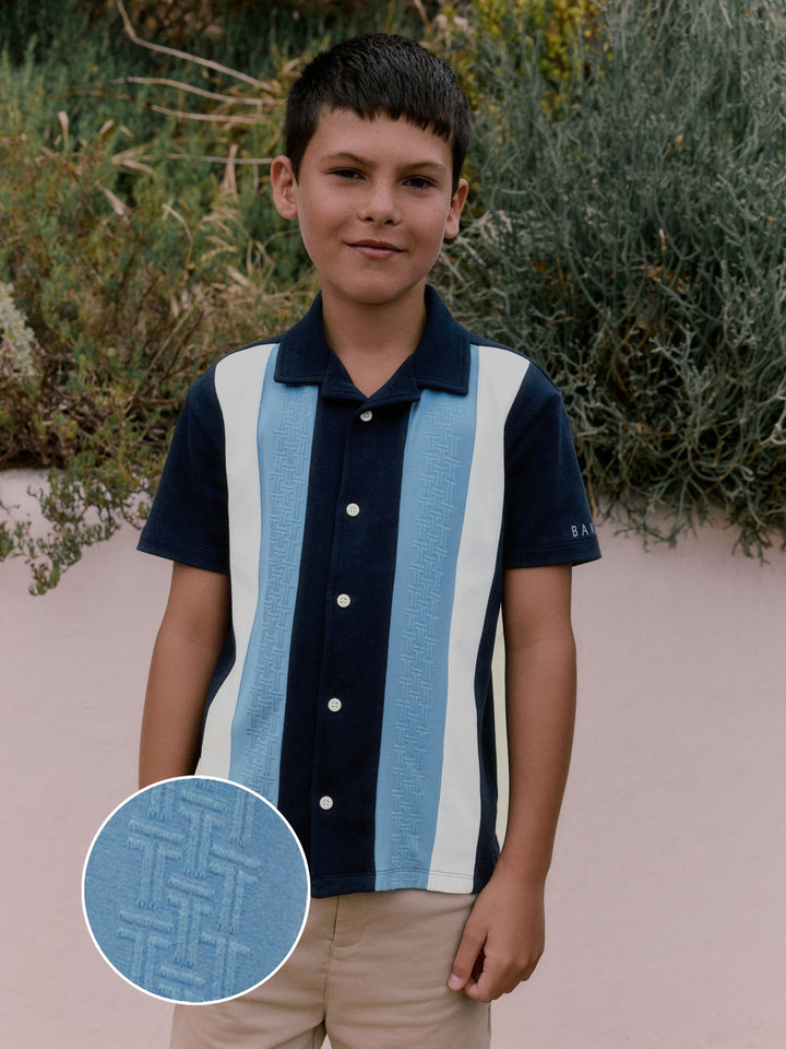 Elevate his casual wardrobe with this smart navy textured stripe shirt from Baker by Ted Baker. Featuring a unique blue 'T' textured panel alongside a contrasting clean white panel, the shirt is finished with white branded buttons and a distinctive blue branded embroidery detail on the sleeve. A smart casual essential for his wardrobe. Textured T panel Branded buttons Branded embroidery on sleeve Main 100% Cotton. Front Panel 93% Cotton, 7% Elastane. Country of Origin: Turkey