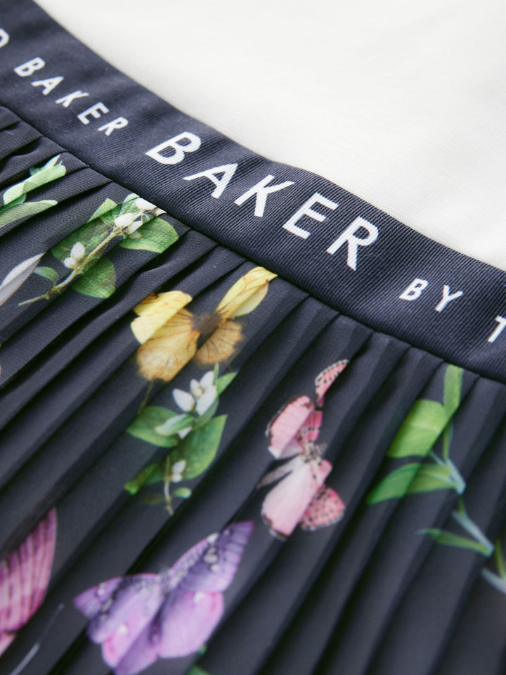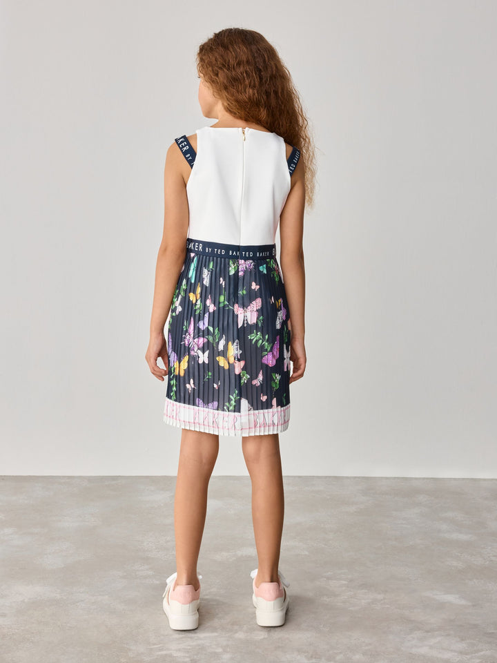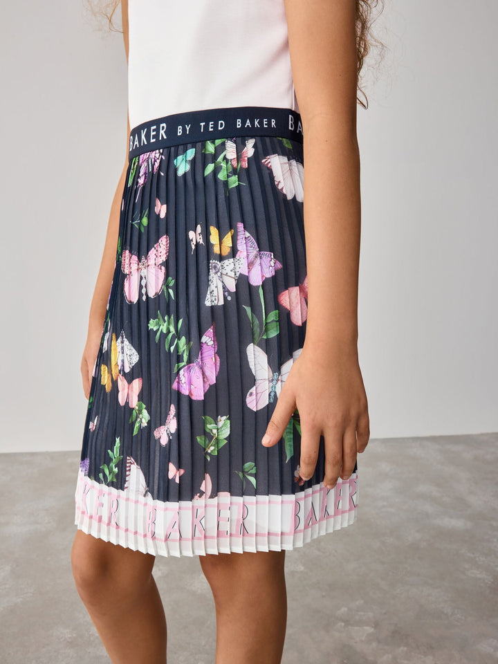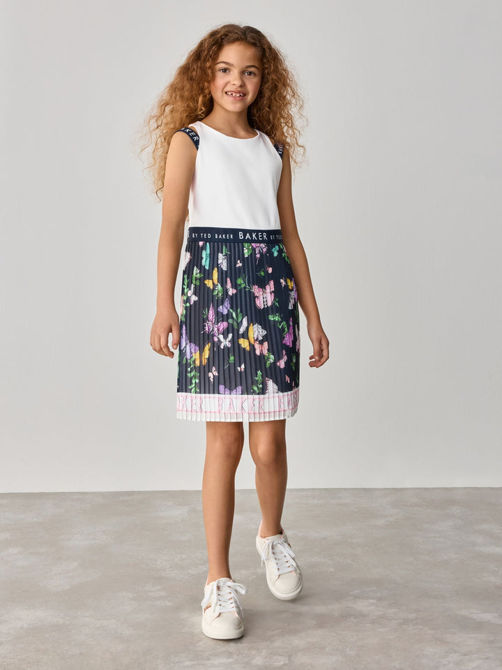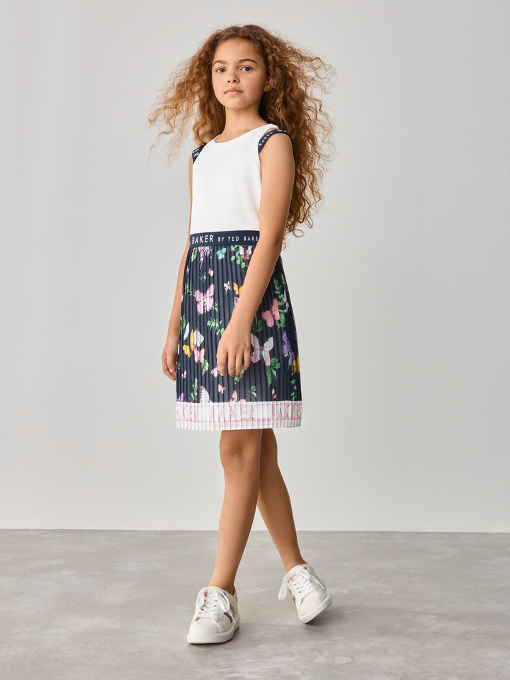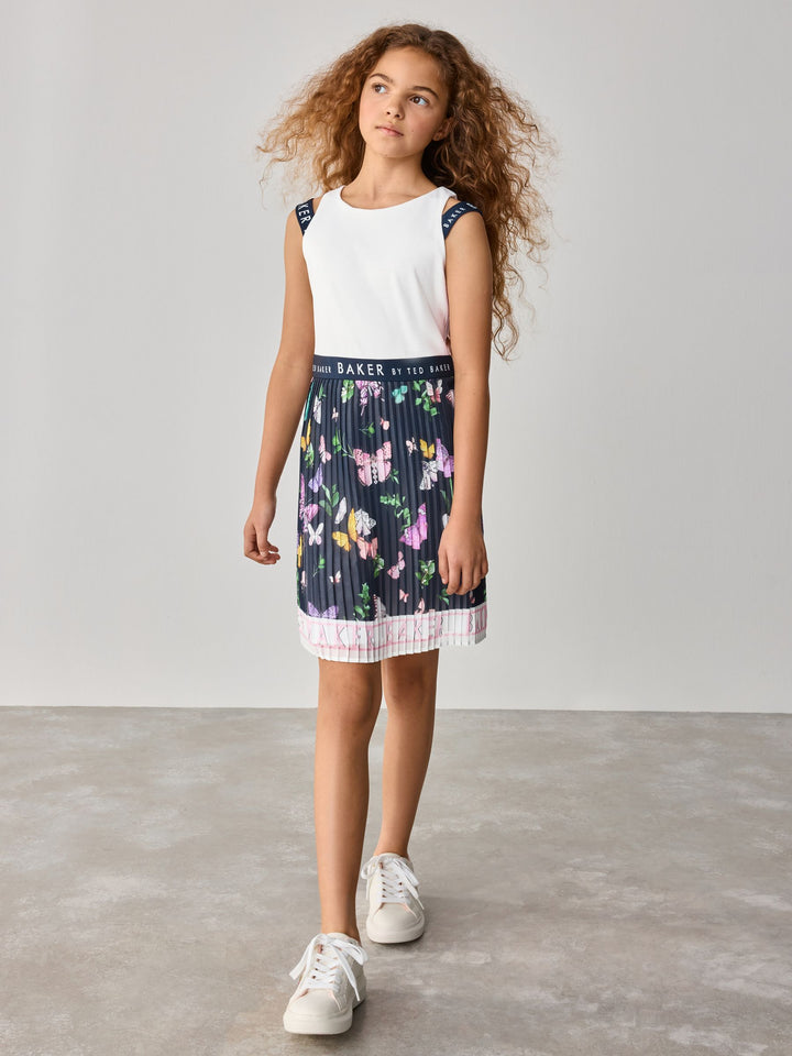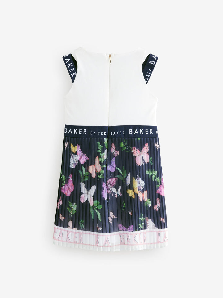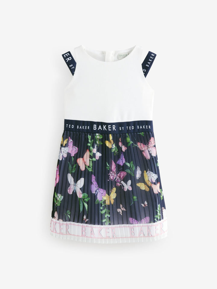 Summer's approaching so get your little one dressed up in this floral mockable dress from Baker by Ted Baker. This stunning dress features a soft body fabric, with branded Baker elastic straps and a matching branded waistband. The skirt is made in a soft chiffon pleated fabric in a stunning butterfly print, with pink Baker branding at the hem all around. Finished with a pale gold zip puller at the back for fastening. Pleated skirt Branded tape features Gold zip fastening Main 96% Polyester, 4% Elastane. Bodice Lining 100% Polyester. Skirt 100% Polyester. Skirt Lining 65% Polyester, 35% Cotton. Country of Origin: Morocco