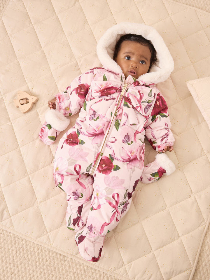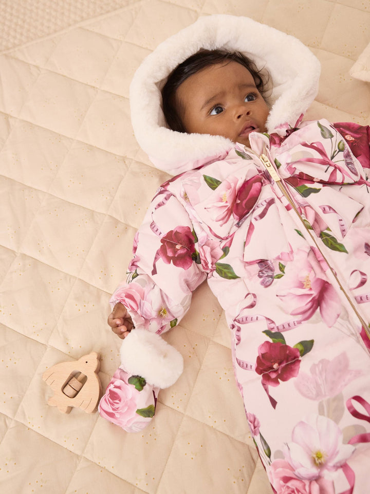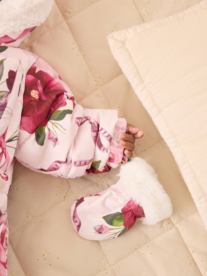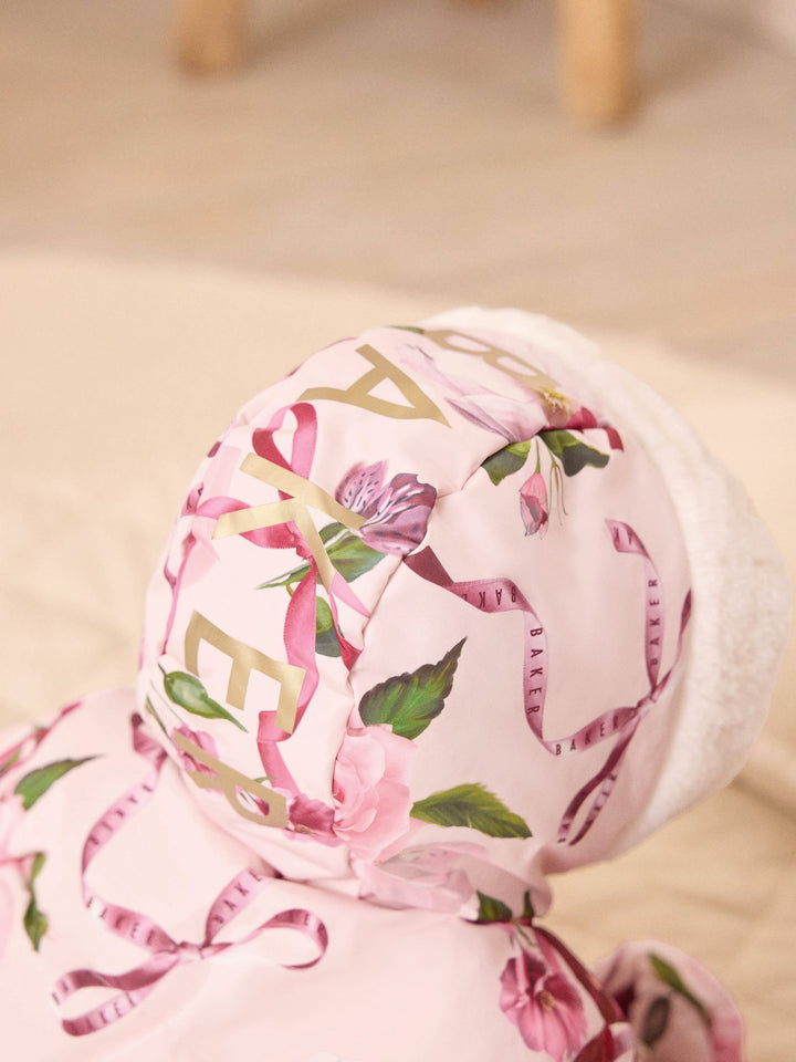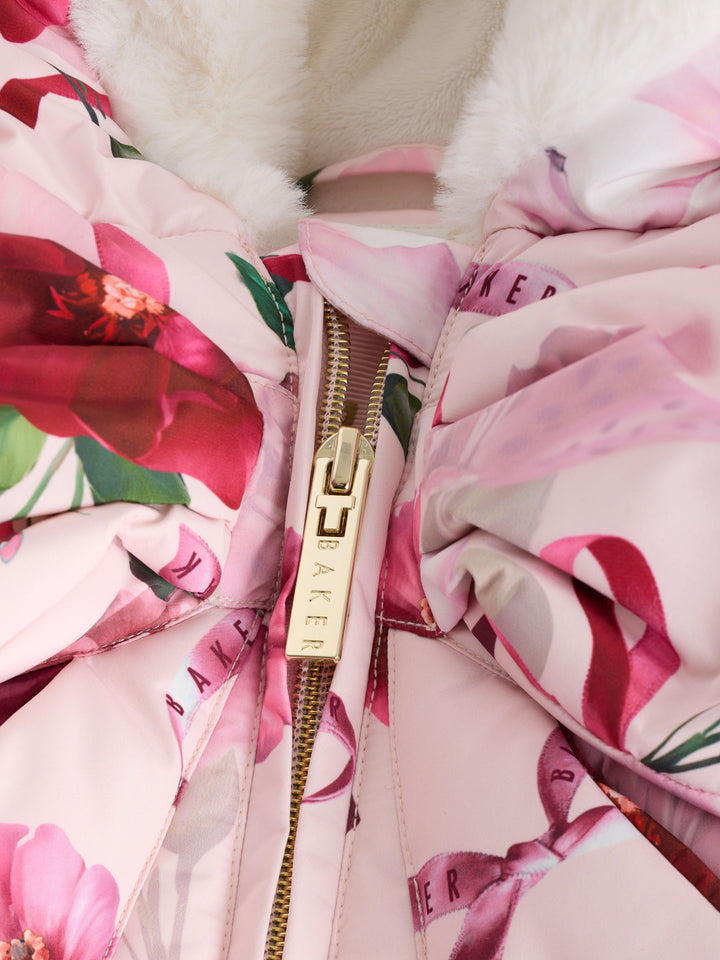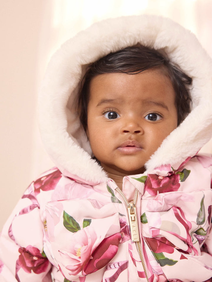 Wrap your little one up warm and cosy for the upcoming winter weather, in this adorable and cosy snowsuit from Baker by Ted Baker. Fleece lined in a warm fabric, this padded snowsuit includes mittens attached, front zip fastening and a faux fleece lined hood. This beautiful floral piece includes a mock bow feature at the centre of the zip fastening. Details include gold embroidered Baker branding at the bottom of the feet and gold foil branding on the inside zip guard. Padded fabric Detachable mittens Baker branded hardware Ages 12 months and older do not include covered legs. Shell 100% Polyester. Artificial Fur 100% Polyester. Lining 100% Polyester. Wadding 100% Recycled polyester. Country of Origin: China Warning: Keep away from fire and flames.