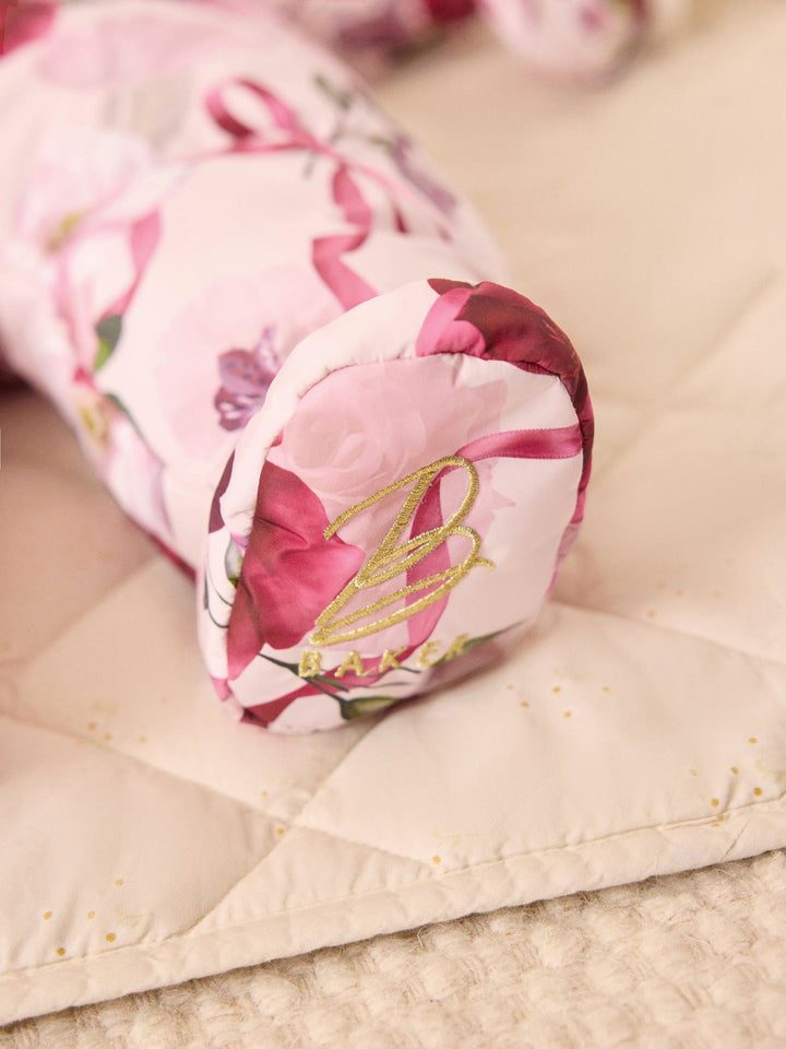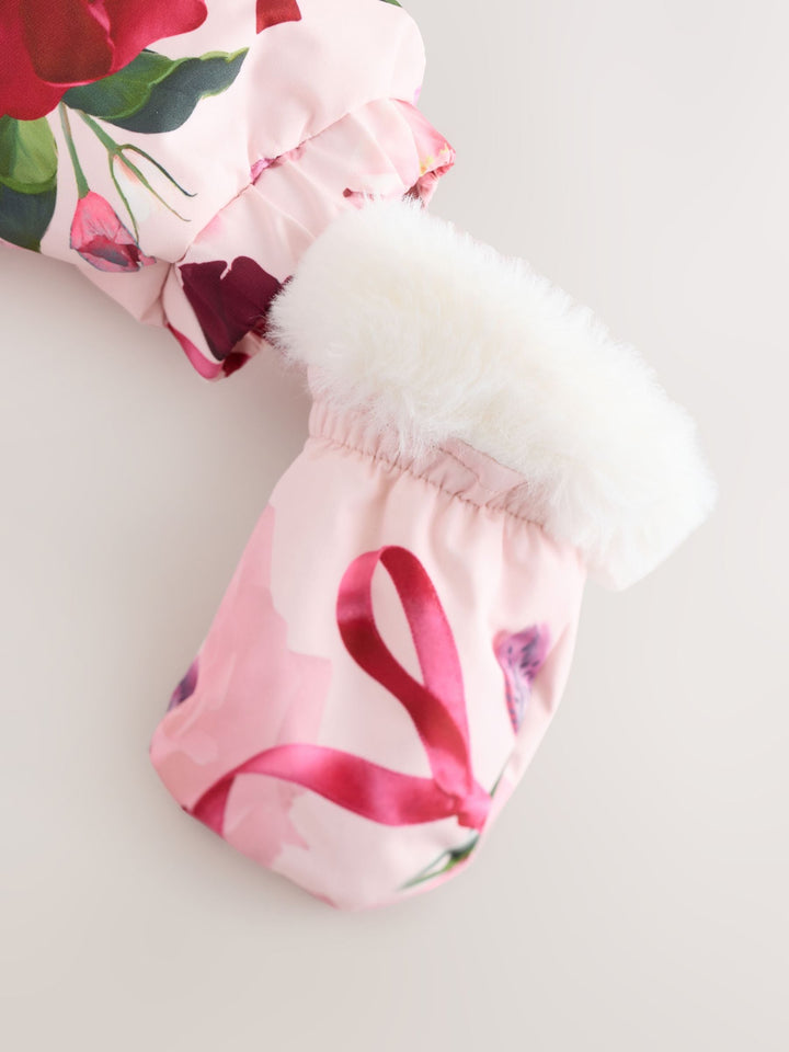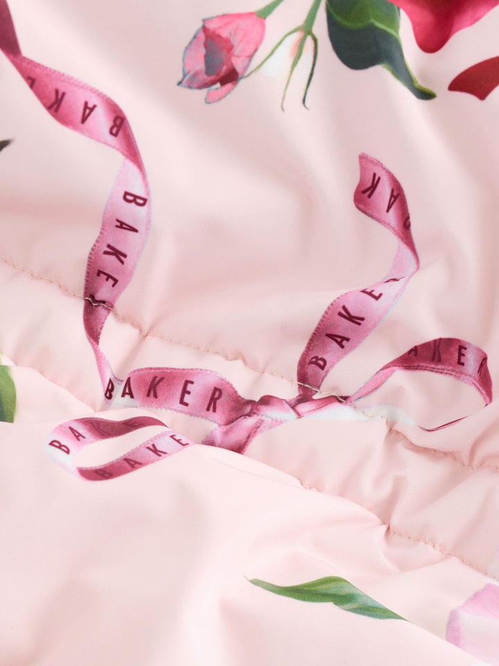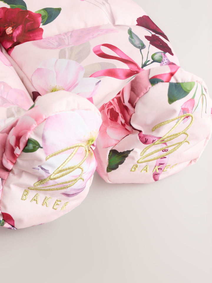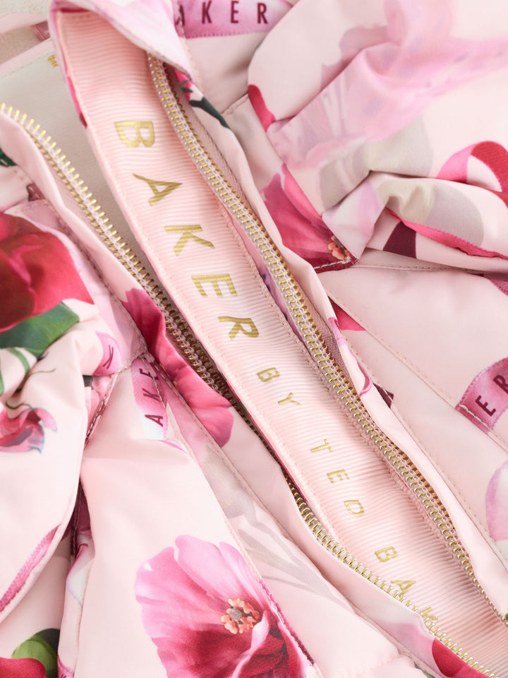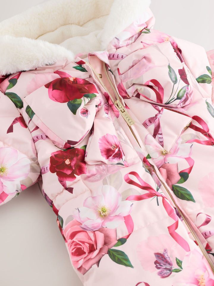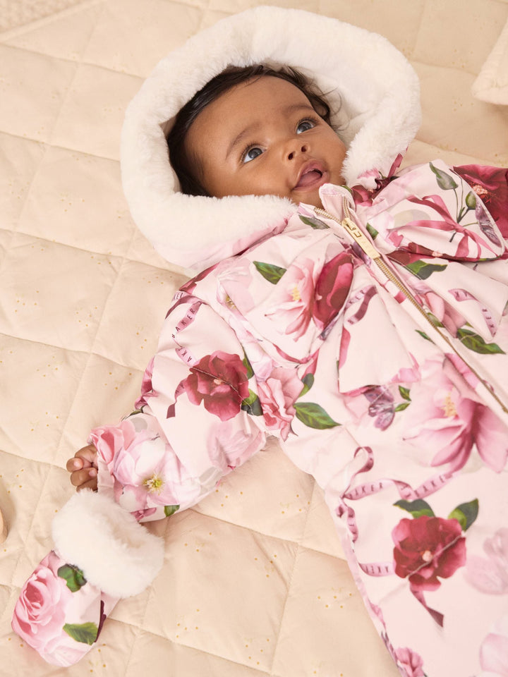 Wrap your little one up warm and cosy for the upcoming winter weather, in this adorable and cosy snowsuit from Baker by Ted Baker. Fleece lined in a warm fabric, this padded snowsuit includes mittens attached, front zip fastening and a faux fleece lined hood. This beautiful floral piece includes a mock bow feature at the centre of the zip fastening. Details include gold embroidered Baker branding at the bottom of the feet and gold foil branding on the inside zip guard. Padded fabric Detachable mittens Baker branded hardware Ages 12 months and older do not include covered legs. Shell 100% Polyester. Artificial Fur 100% Polyester. Lining 100% Polyester. Wadding 100% Recycled polyester. Country of Origin: China Warning: Keep away from fire and flames.