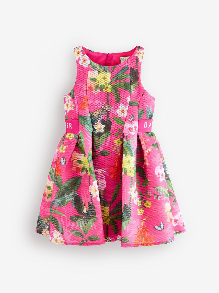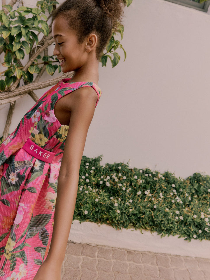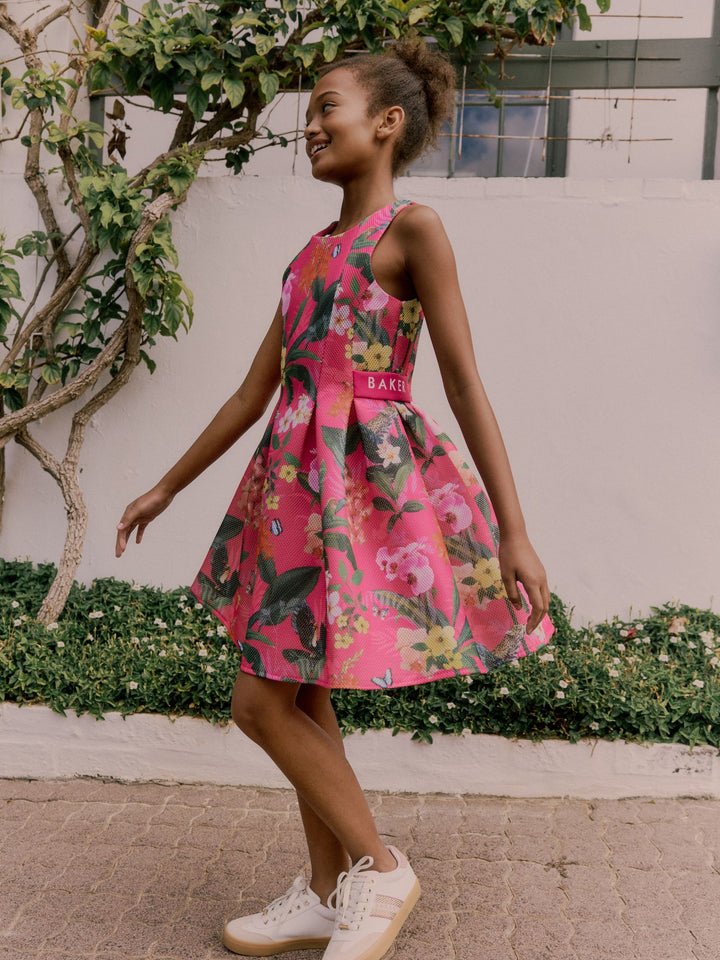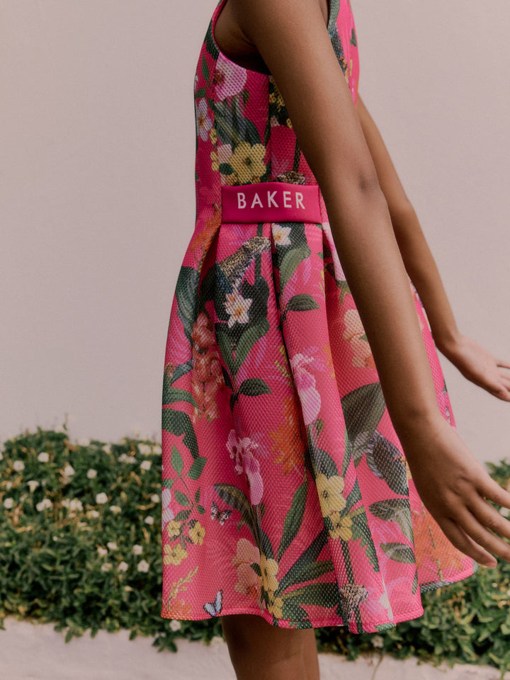 Dress her up in florals this season with this beautiful floral airtex dress from Baker by Ted Baker. Crafted in a soft and structured scuba airtex fabric, this hot pink floral printed dress has been designed with branded pink Baker waistband at both sides of the waist and a structured skirt shape ready for twirling. Team it with a pair of pretty trainers to complete her outfit. Main 100% Polyester. Lining 100% Polyester. Trim 100% Polyester. Country of Origin: Morocco