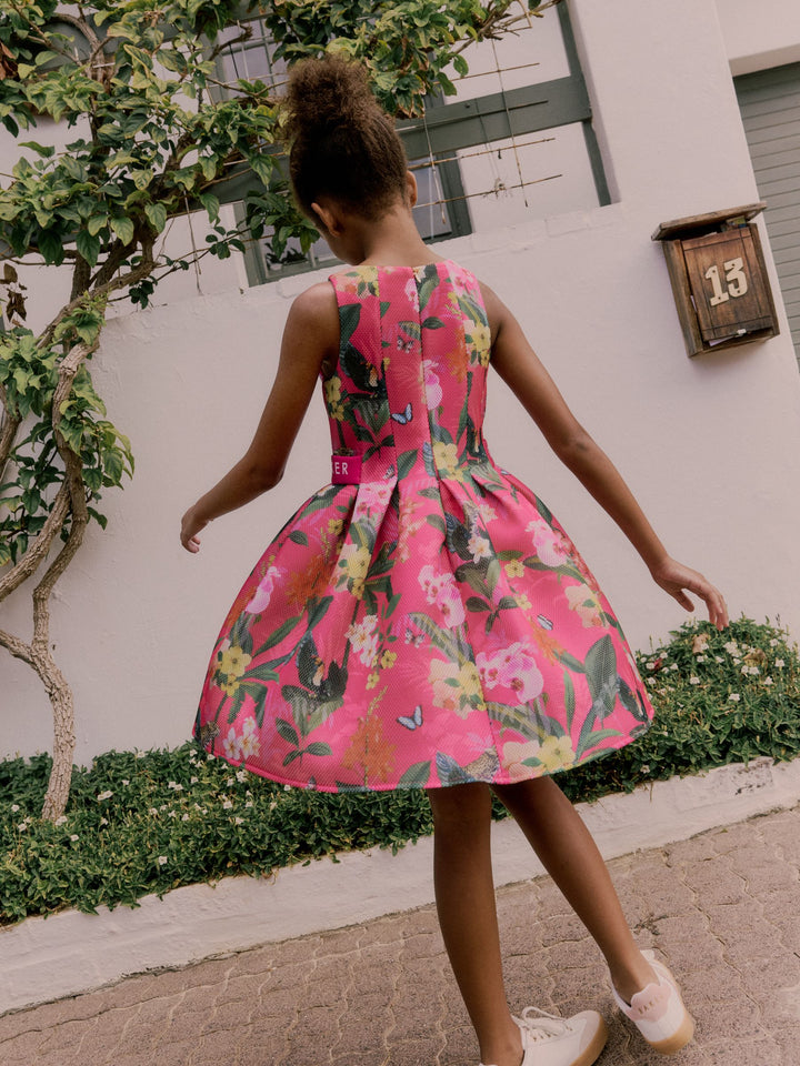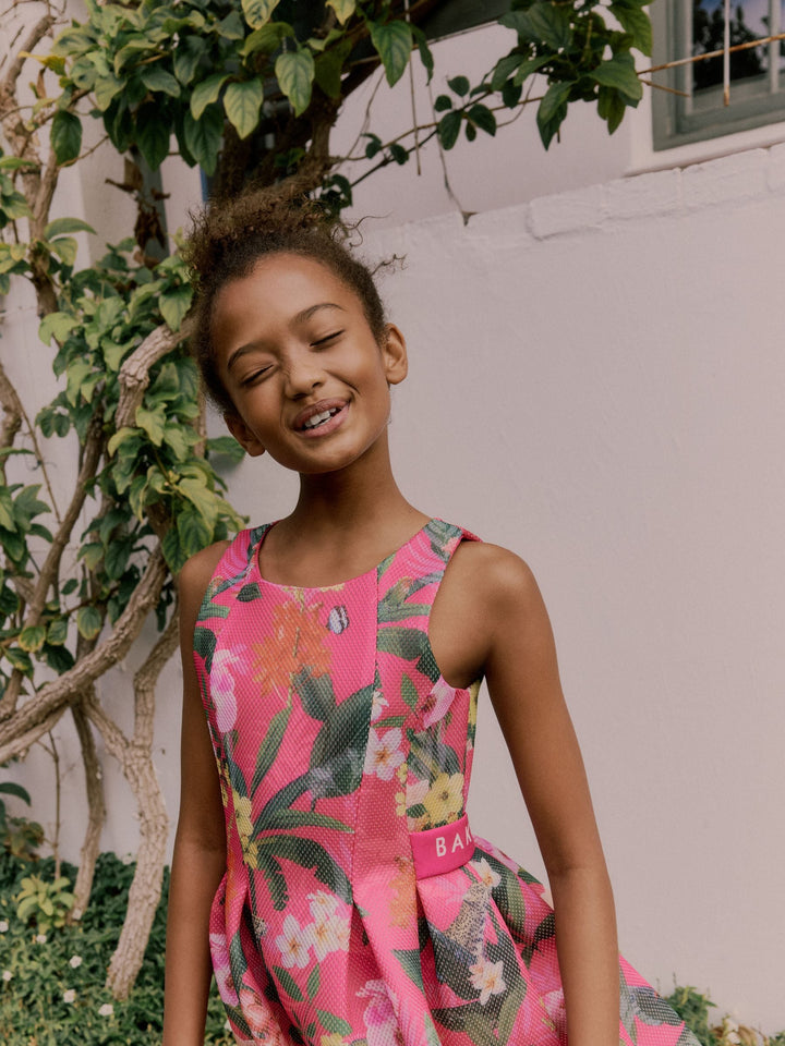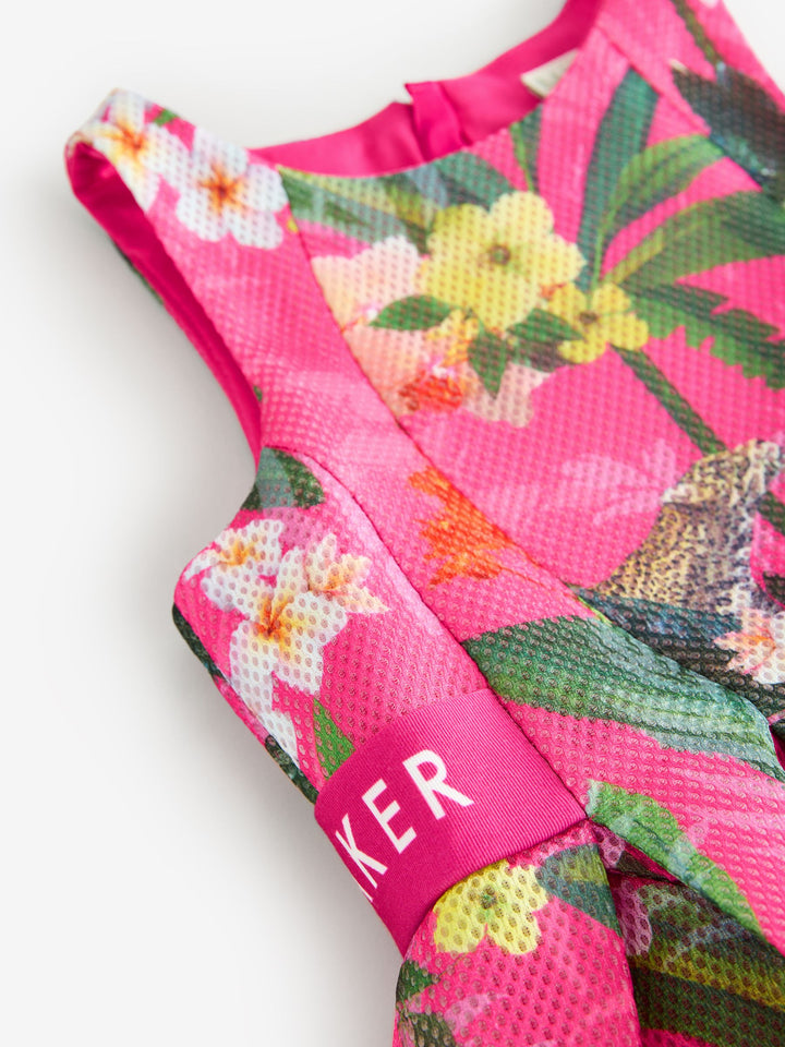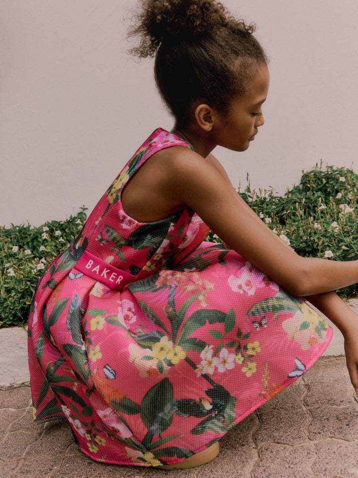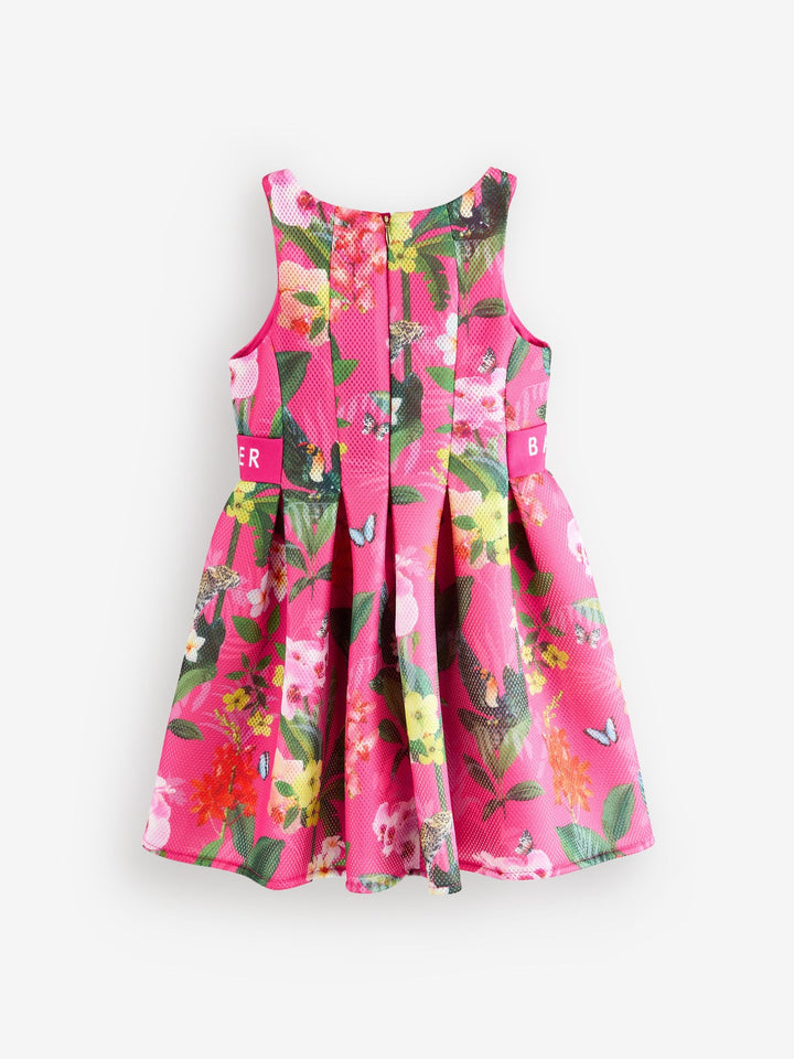Dress her up in florals this season with this beautiful floral airtex dress from Baker by Ted Baker. Crafted in a soft and structured scuba airtex fabric, this hot pink floral printed dress has been designed with branded pink Baker waistband at both sides of the waist and a structured skirt shape ready for twirling. Team it with a pair of pretty trainers to complete her outfit. Main 100% Polyester. Lining 100% Polyester. Trim 100% Polyester. Country of Origin: Morocco