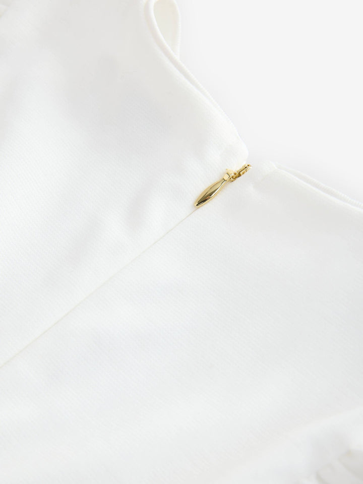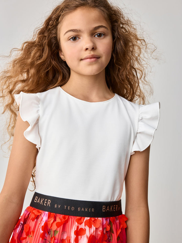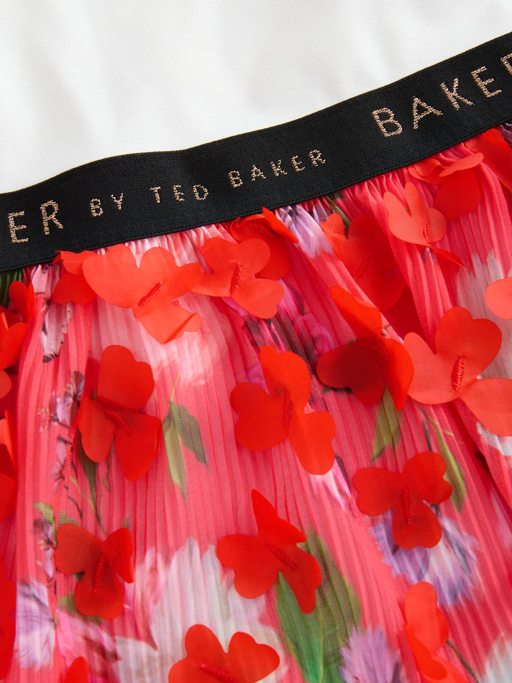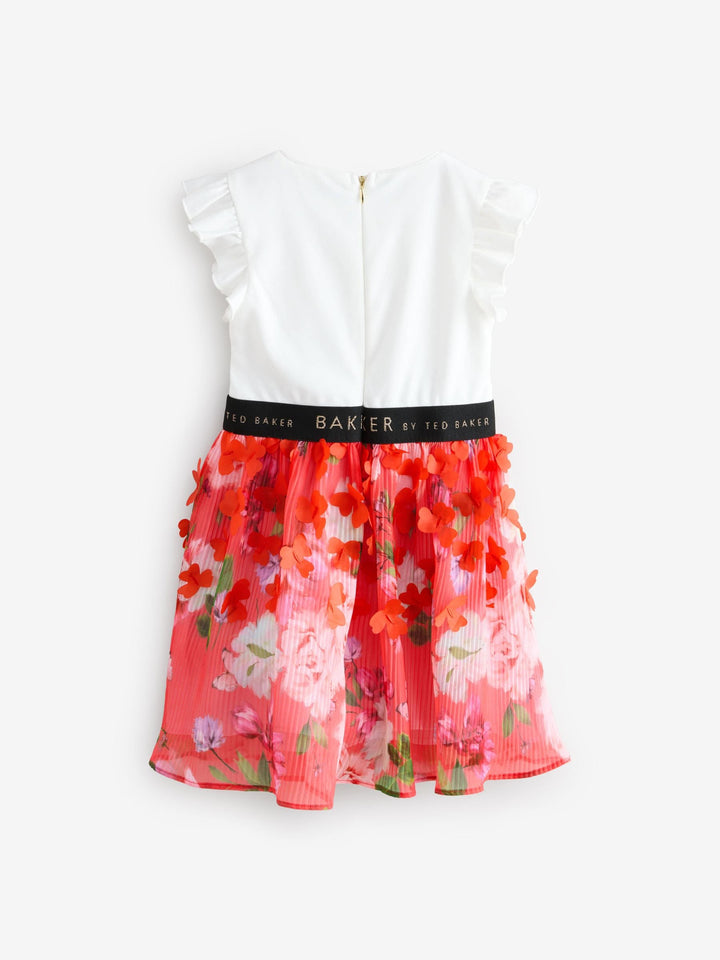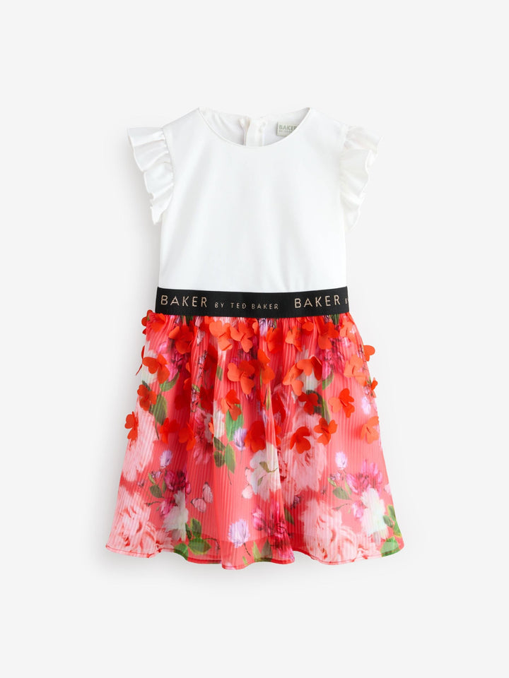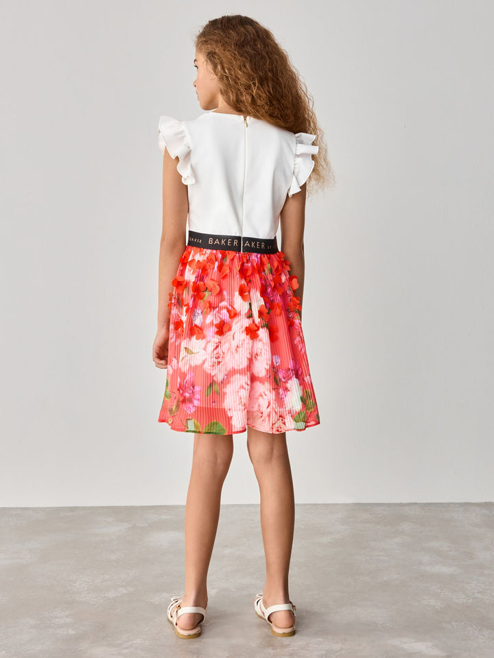 Get ready for summer with this floral pleated dress from Baker by Ted Baker. This stunning mockable dress comes in a soft fabric with a white top, featuring frill sleeve details and a black metallic detail branded waistband. The bottom skirt features a gorgeous pleated mesh overlay with 3D floral features. The dress includes a pale gold zip fastening at the back. The most perfect dress for a summer day. Main 96% Polyester, 4% Elastane. Body Lining 100% Polyester. Skirt 100% Polyester. Country of Origin: Morocco