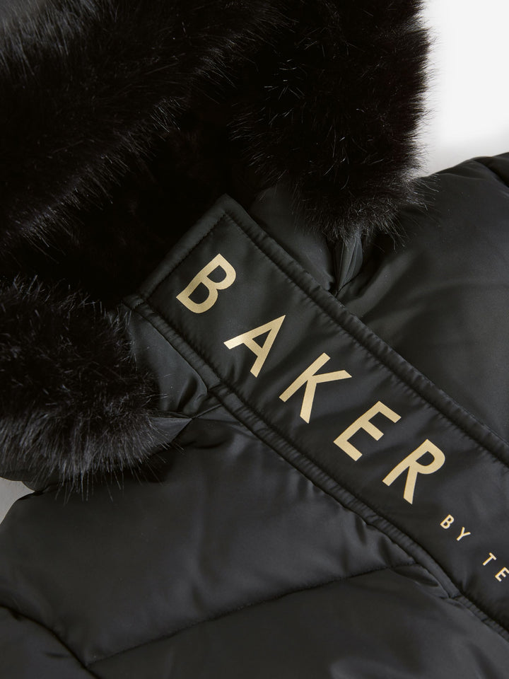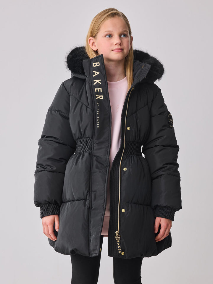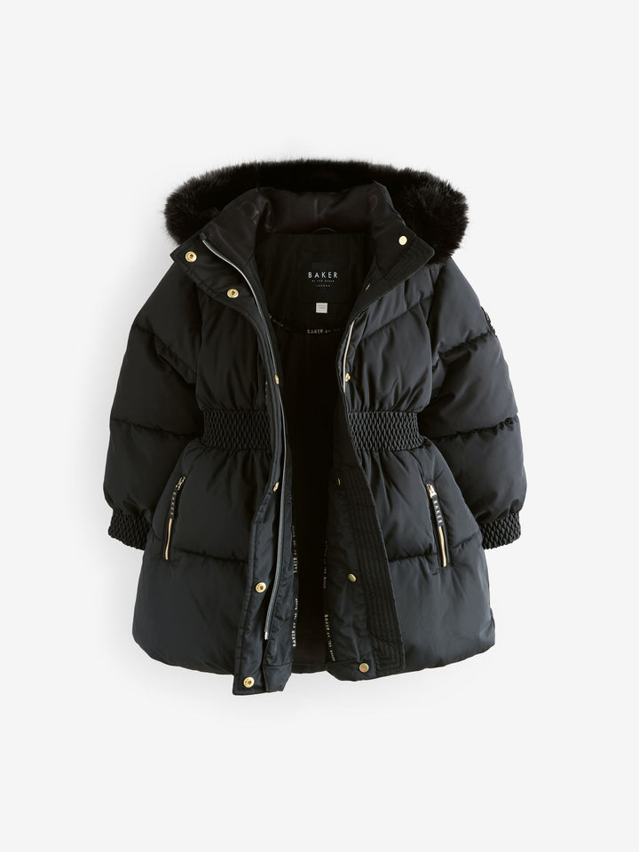 Layer her up and get her ready for the cold weather in this gorgeous skirted padded coat from Baker by Ted Baker. Fashionable yet functionable, this coat includes a lovely faux fur trim hood, while featuring ruching at the waist and cuffs. It includes a soft gold zip fastening as well as printed Baker branding along the hem in gold. Further details include branded zip pullers on the pockets, gold branded poppers and a gold branded badge on the arm. Elevated with a skirted hem, the coat gives an elegant silhouette she'll love. Shower resistant Skirted hem shape Gold Baker branded hardware Shell 100% Polyester. Outer Lining 100% Polyester. Back Lining 100% Polyester. Wadding 100% Polyester. Hood 60% Acrylic, 23% Polyester, 17% Modacrylic. Country of Origin: China Shower resistant, water repellent finish to provide protection against light rain.