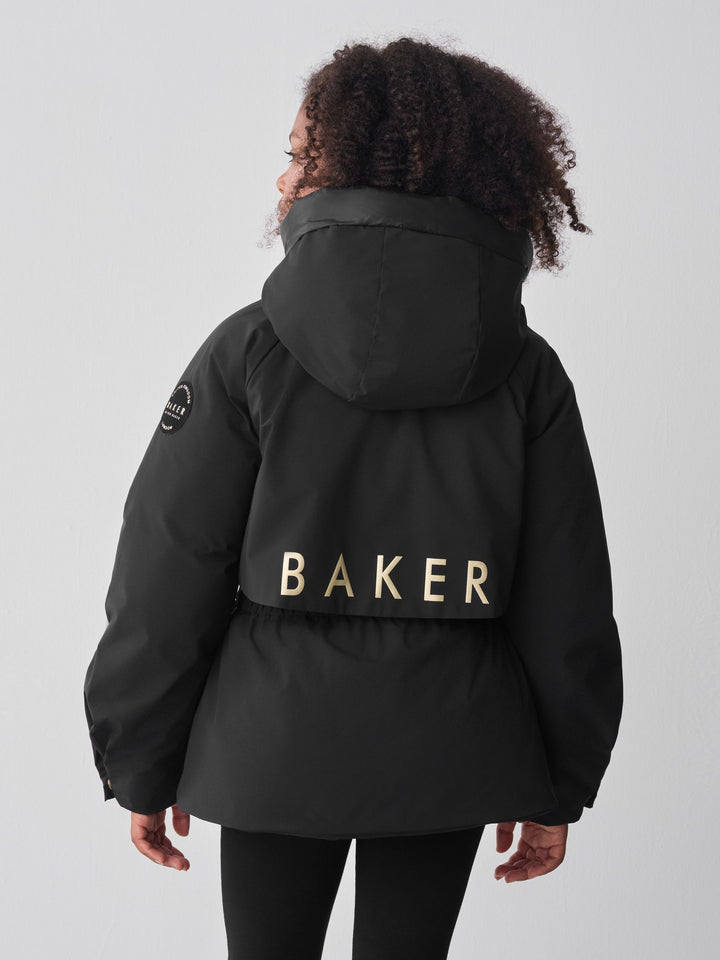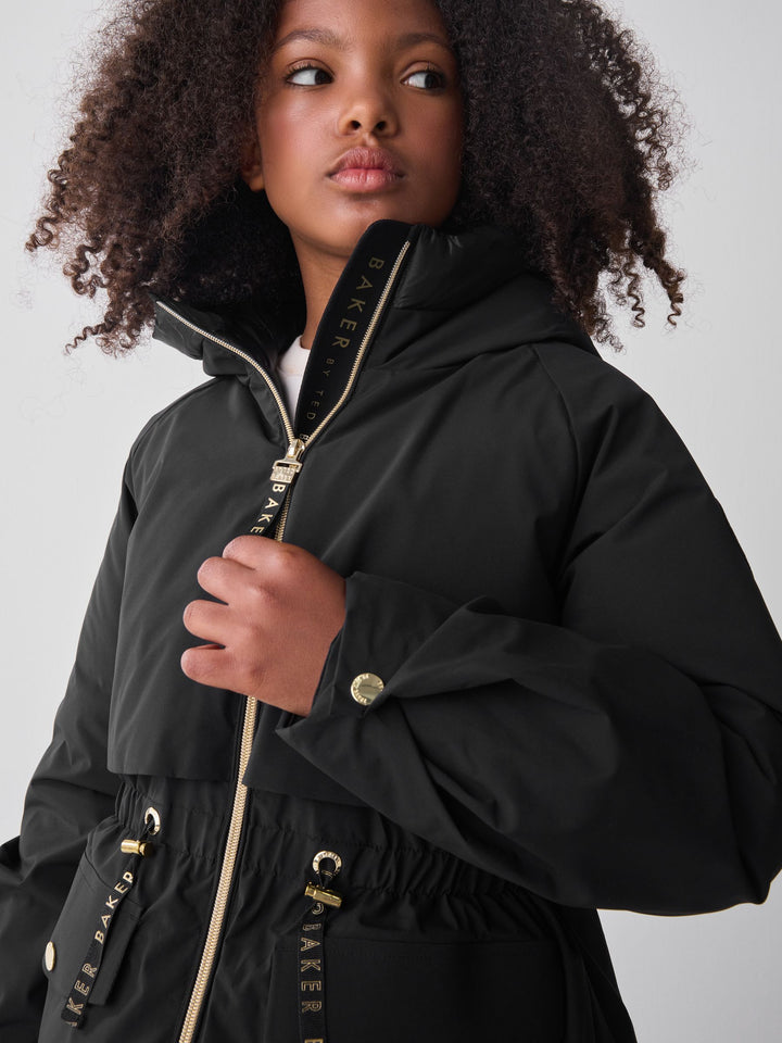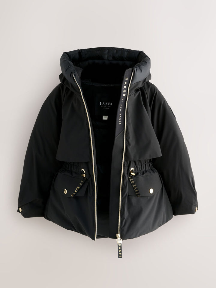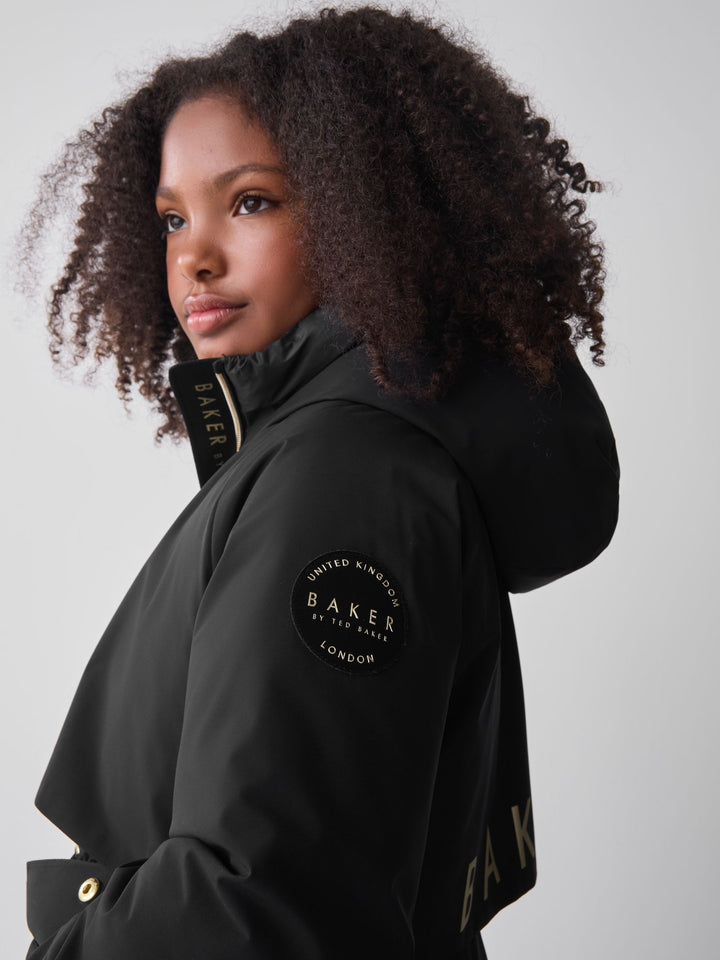 Ready for winter, she'll look stylish in this skirted parka coat from Baker by Ted Baker. Made in a shower-resistant material, this hooded short parka coat is an essential for her winter wardrobe. The coat features a storm panel across the back leading to the front, with gold branded toggles at the waist and a gold branded zip puller. The coat also features functional pockets with gold branded poppers. Details include a Baker branded badge on the arm and printed Baker branding across the back storm flap. Shower resistant Toggles at waist Gold branded details Shell 100% Polyester. Body Lining 100% Nylon. Sleeve Lining 100% Polyester. Wadding 100% Polyester. Country of Origin: China