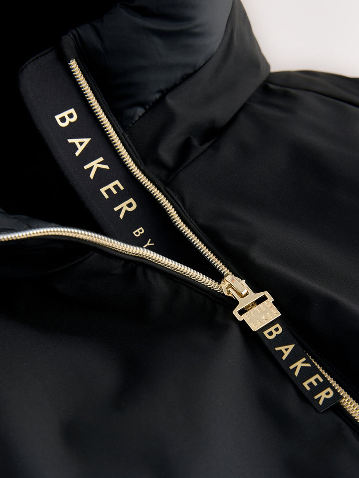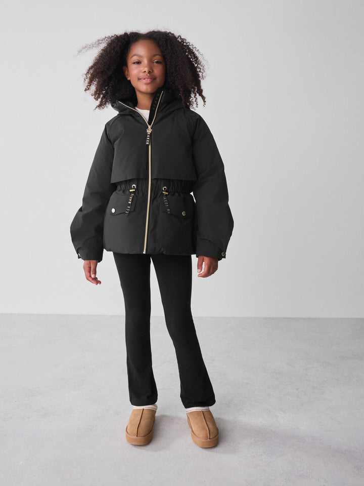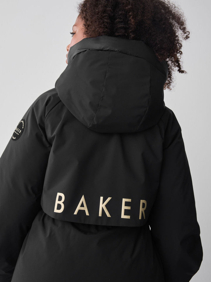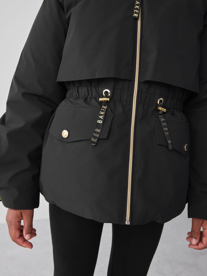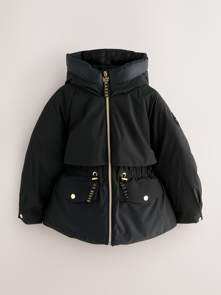 Ready for winter, she'll look stylish in this skirted parka coat from Baker by Ted Baker. Made in a shower-resistant material, this hooded short parka coat is an essential for her winter wardrobe. The coat features a storm panel across the back leading to the front, with gold branded toggles at the waist and a gold branded zip puller. The coat also features functional pockets with gold branded poppers. Details include a Baker branded badge on the arm and printed Baker branding across the back storm flap. Shower resistant Toggles at waist Gold branded details Shell 100% Polyester. Body Lining 100% Nylon. Sleeve Lining 100% Polyester. Wadding 100% Polyester. Country of Origin: China