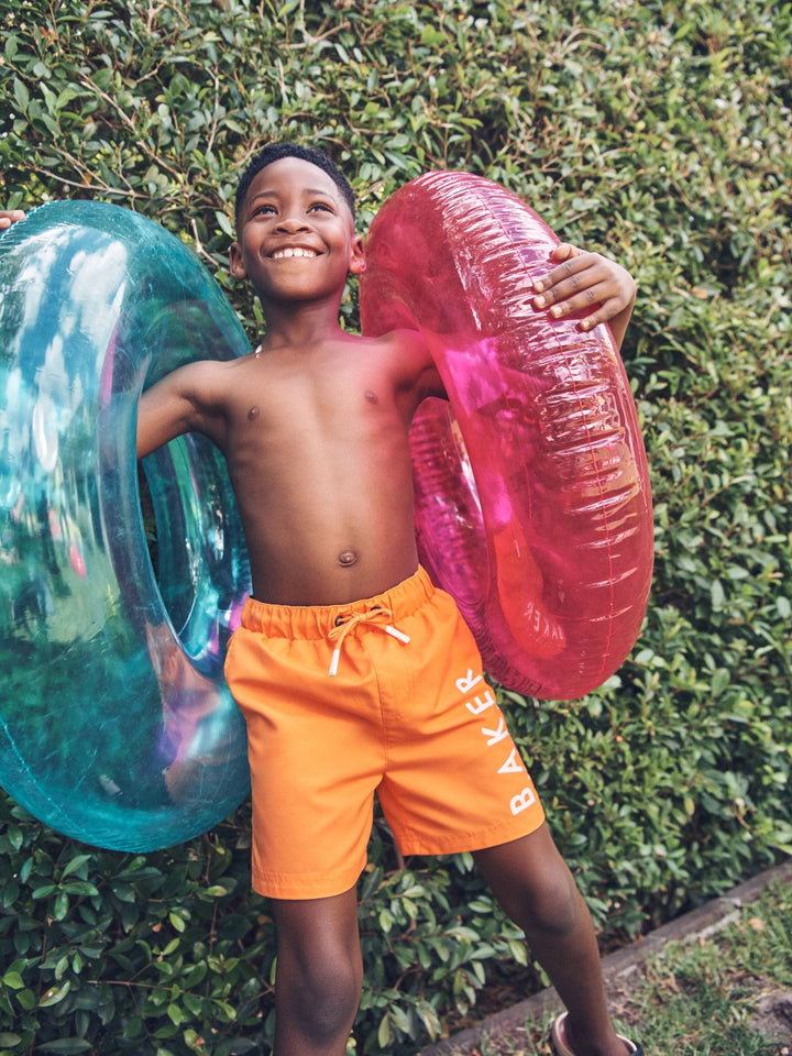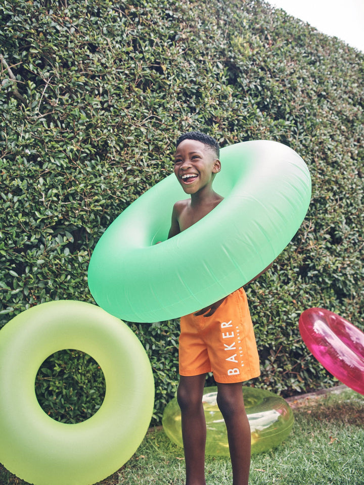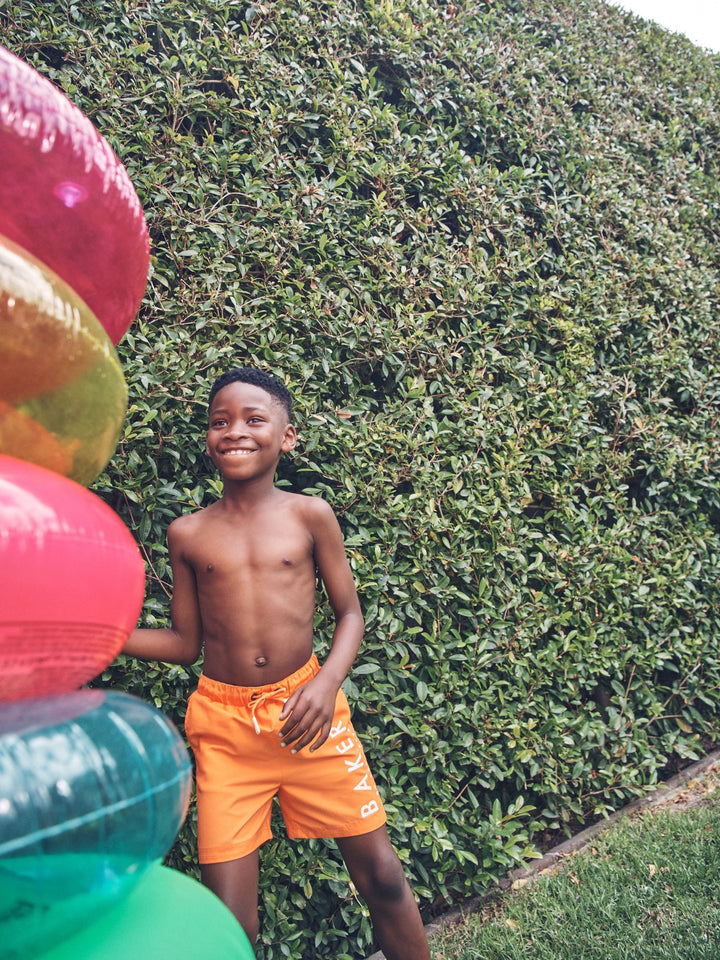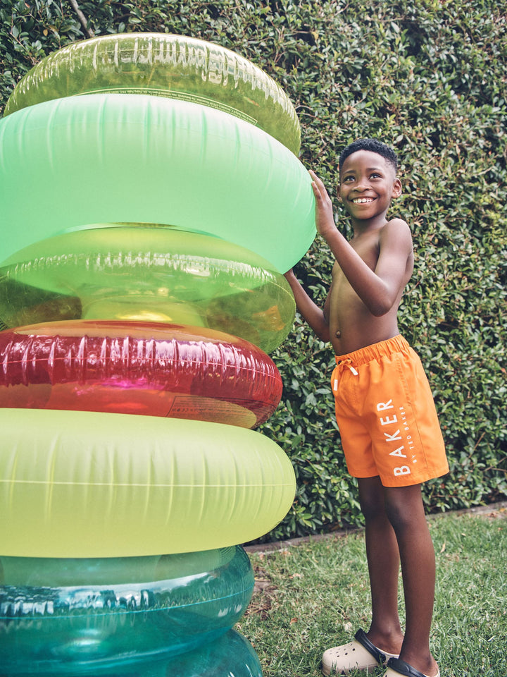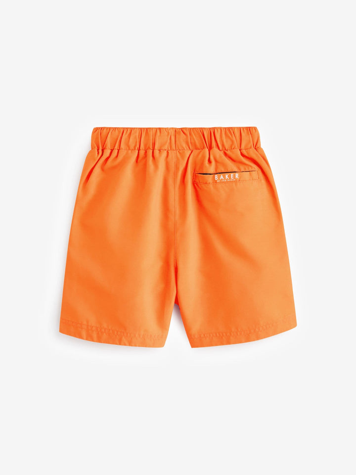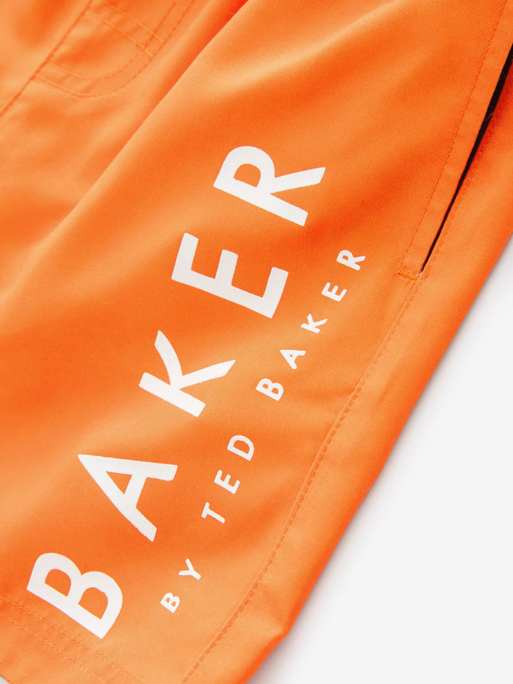 He can hit the beach in style wearing these eye-catching shorts from Baker by Ted Baker. The bright orange relaxed fit shorts have been designed with an elasticated drawcord waistband for a comfortable fit and they are made from a lightweight polyester to keep him cool. They are finished with the iconic branding printed down the leg in white. Elasticated waistband Polyester Branded detail down the leg Main 100% Polyester. Lining 100% Polyester. Country of Origin: China