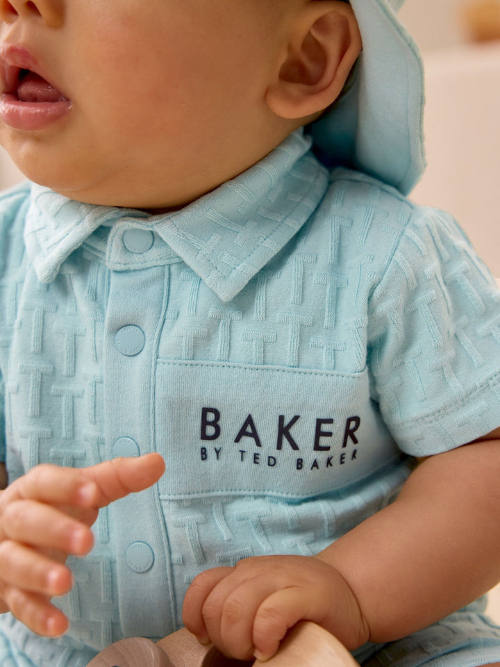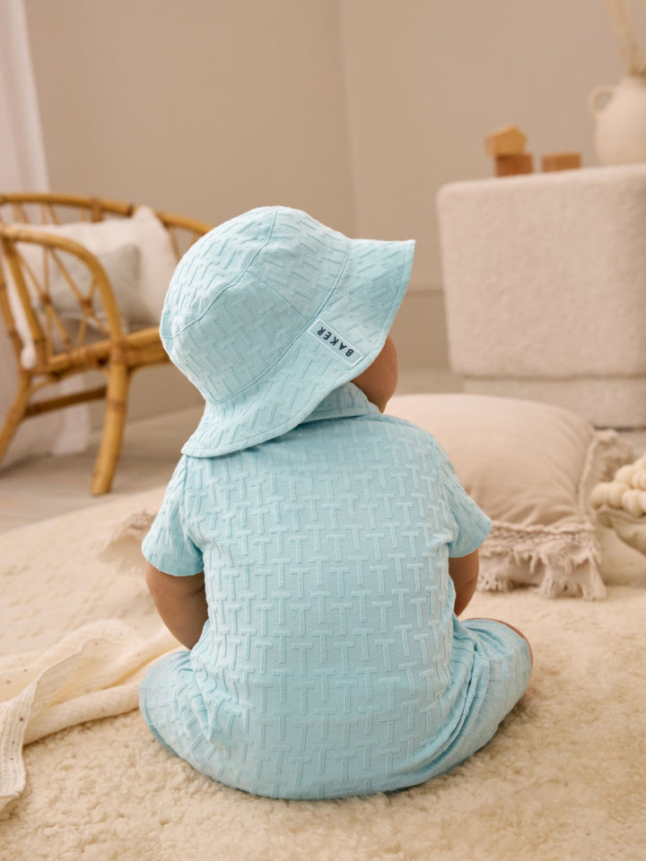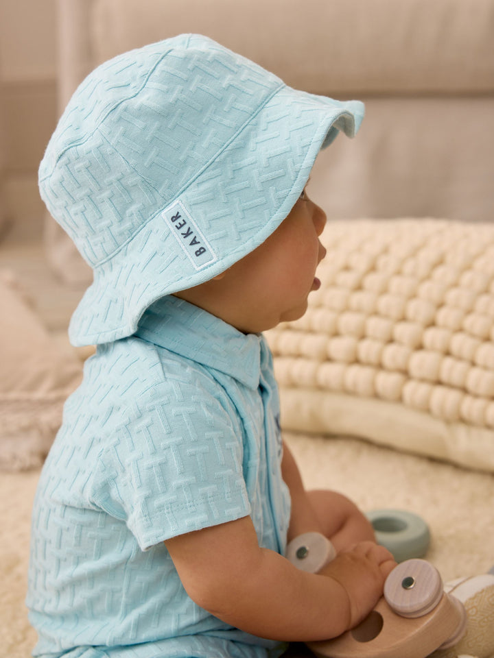 A cute and coordinated look for warm weather days, this Baker by Ted Baker romper and hat set is perfect for summer. The soft all-in-one is made from a cotton-rich blend in an all-over textured T design. Featuring a smart collar, branded snap buttons and Baker branding to the chest. The set is finished with an adorable matching bucket hat. Romper and Hat set Textured T design Branded snap buttons Romper 93% Cotton, 7% Elastane. Hat Main 93% Cotton, 7% Elastane. Lining 100% Cotton. Country of Origin: China