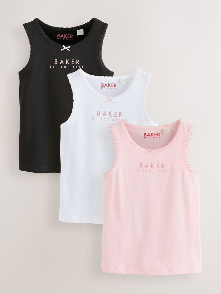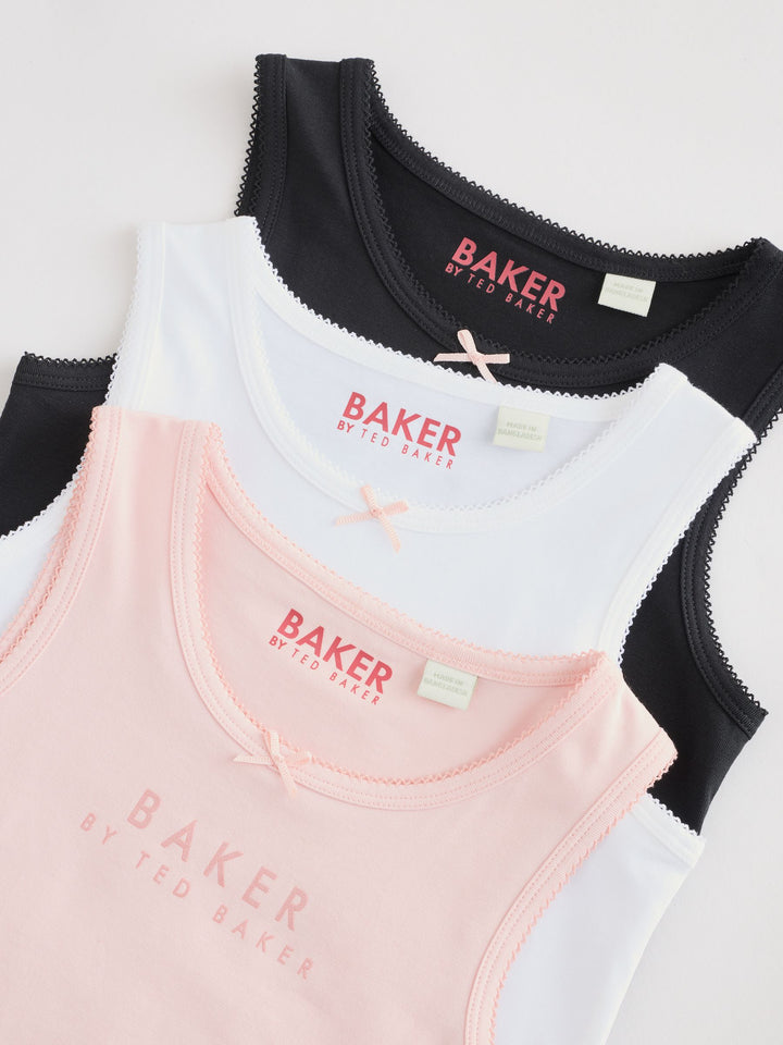 Take care of her wardrobe staples with this stylish vests pack from Baker by Ted Baker. The multipack includes three vests each made from soft and breathable cotton in different colourways and pretty prints. They are all designed with a round neck, pretty picot trim detail, plus the iconic Baker branding. 3 pack Picot trim detail Foil Baker branding 3 x Vest 95% Cotton, 5% Elastane. Country of Origin: Bangladesh
