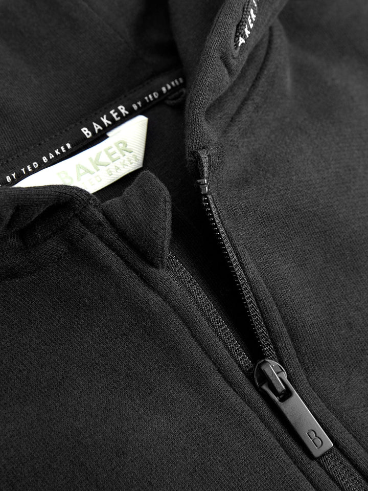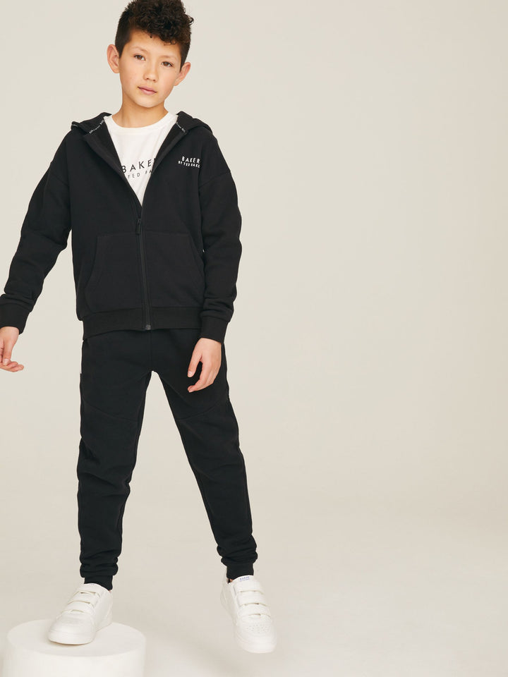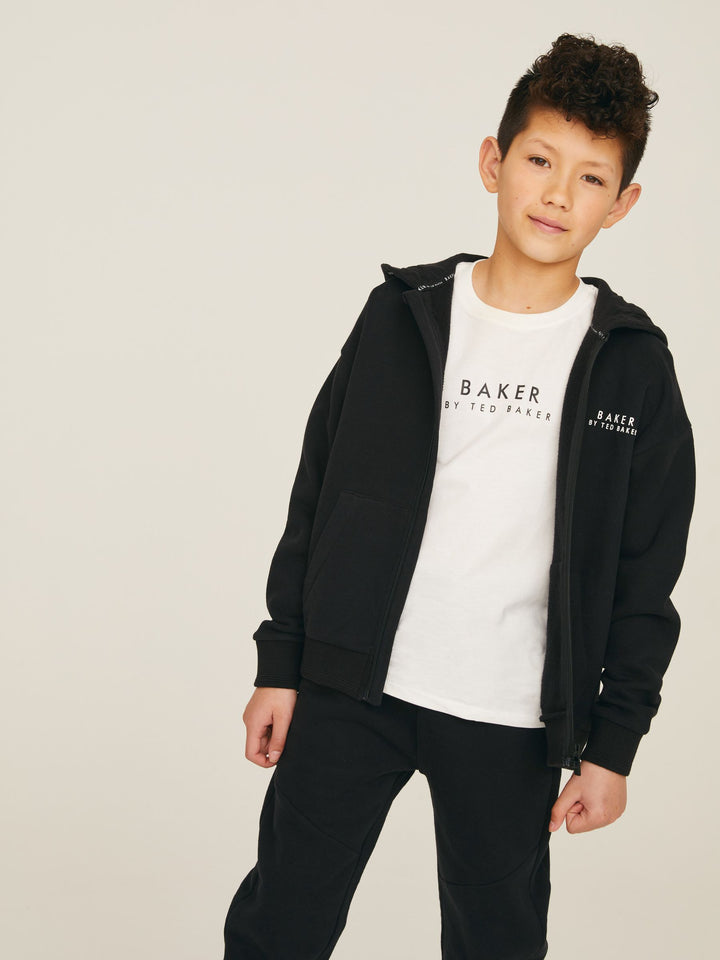 Made for days off, this classic and comfortable co-ord set from Baker by Ted Baker will keep your little man looking and feeling great.The matching set in black includes a zip-through hooded top that boasts a branded detail on the chest, front pockets and branded drawcords on the cosy hood.It comes with a pair of joggers that also have branded drawcords on the elasticated waistband and branding down the leg all the way to the cuffed ankles. Zip Through and Jogger 100% Cotton. Country of Origin: Bangladesh