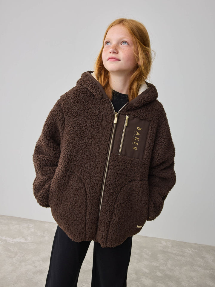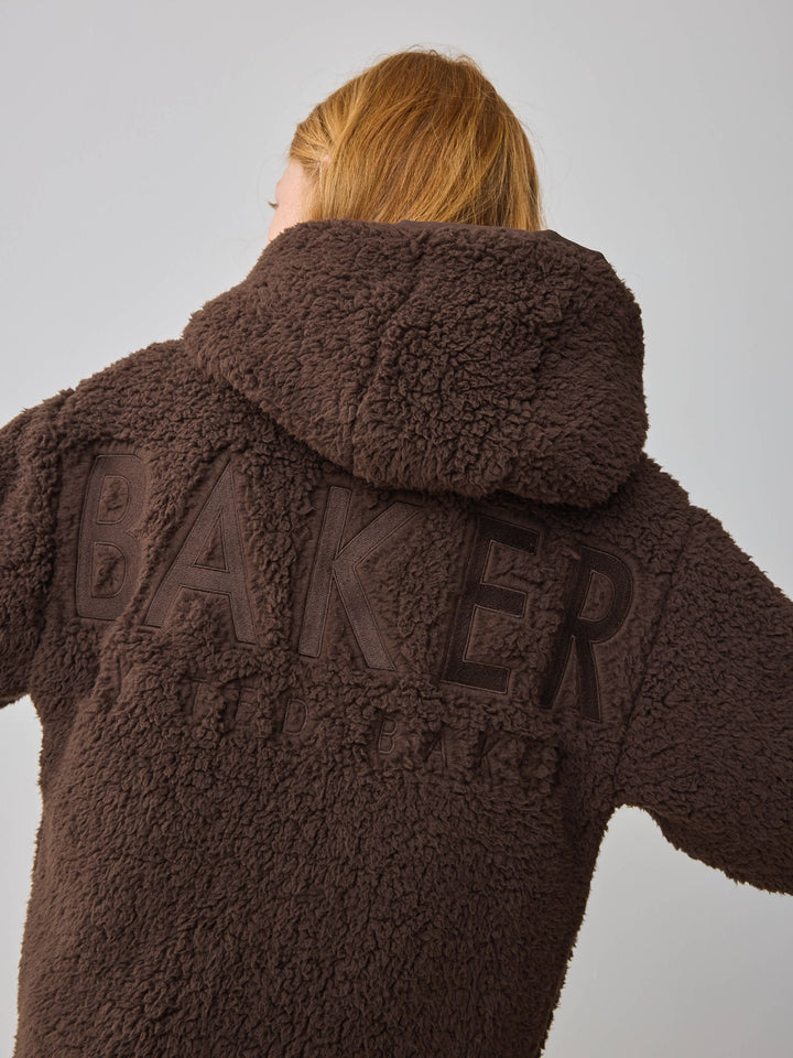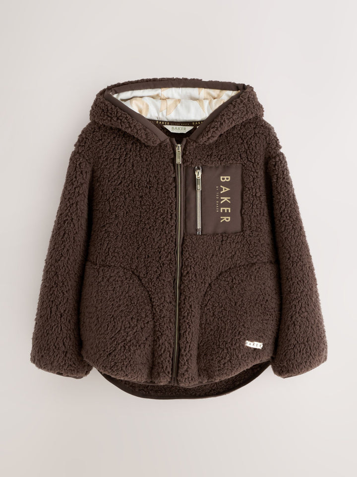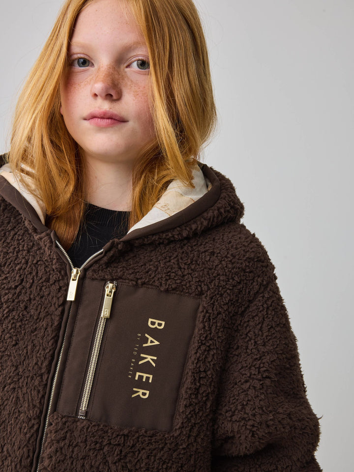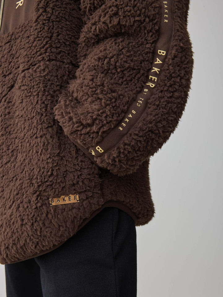 This fleece jacket from Baker by Ted Baker is the perfect layering piece this season. This jacket comes in a soft borg teddy fleece, with soft jersey lining inside. Featuring large branded Baker embroidery across the back, and branded Baker tape detailing down the arms. This fleece also includes a branded patch pocket on the front, along with gold branded hardware. Pair with some jeans and trainers for the perfect outfit. Baker branded tape Branded patch embroidery Gold hardware Shell 100% Polyester. Hood Lining 100% Cotton. Country of Origin: China