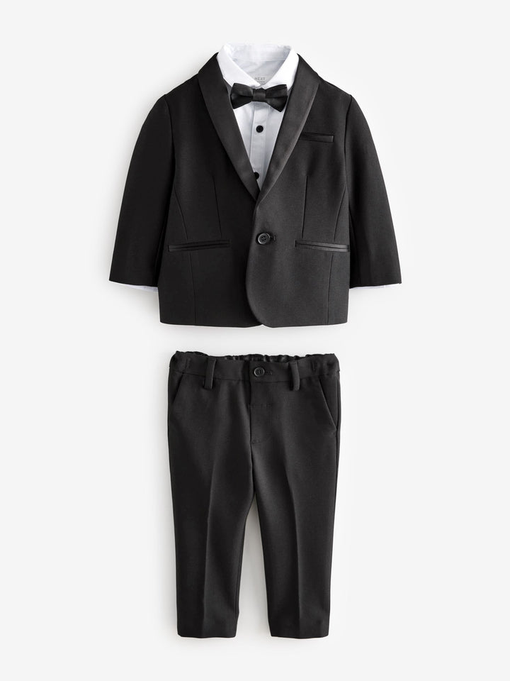 This 4-piece set will have your little dude looking formal and stylish, featuring a blazer jacket with a satin lapel collar and trimmed pockets, matching trousers with an adjustable waistband, a pure cotton shirt and a bow tie. 4-piece set Blazer jacket Matching trousers Cotton shirt Bow tie Jacket Main 78% Polyester, 18% Viscose, 4% Elastane. Lining 100% Polyester. Shirt 100% Cotton. Trouser 78% Polyester, 18% Viscose, 4% Elastane. Bow Tie 100% Polyester. Country of Origin: Cambodia