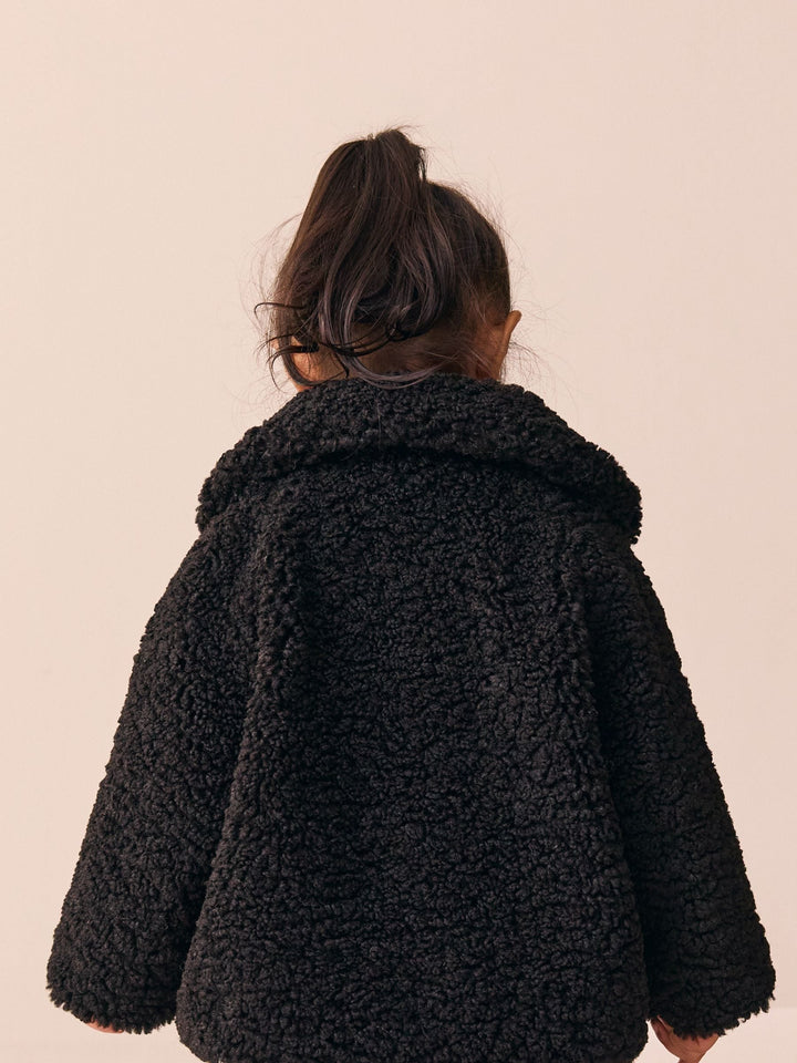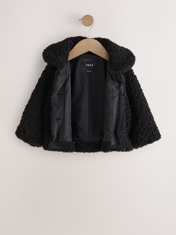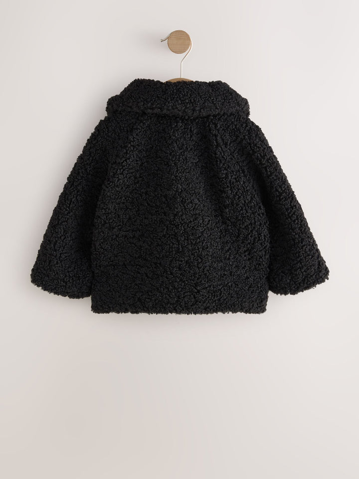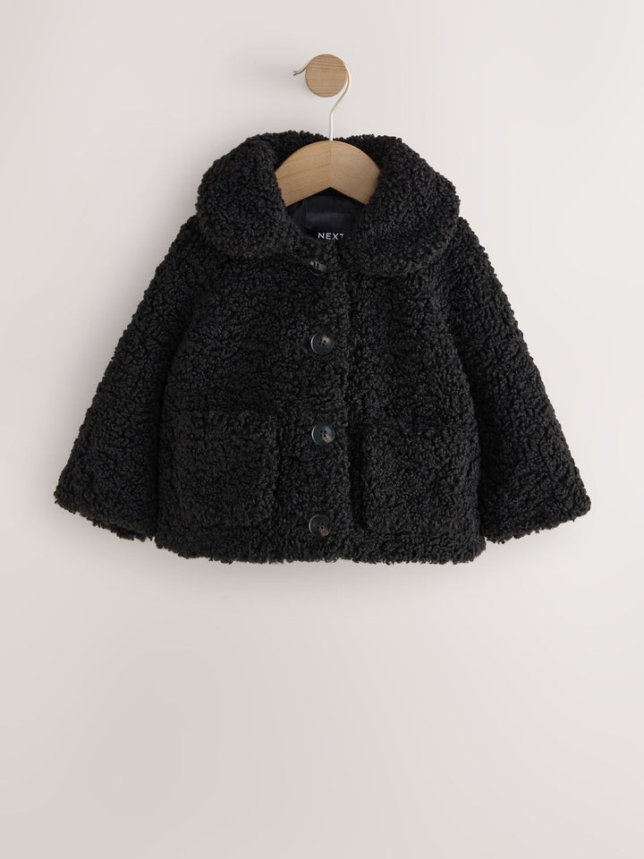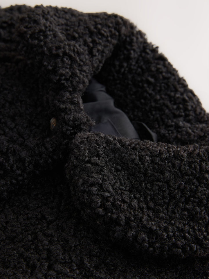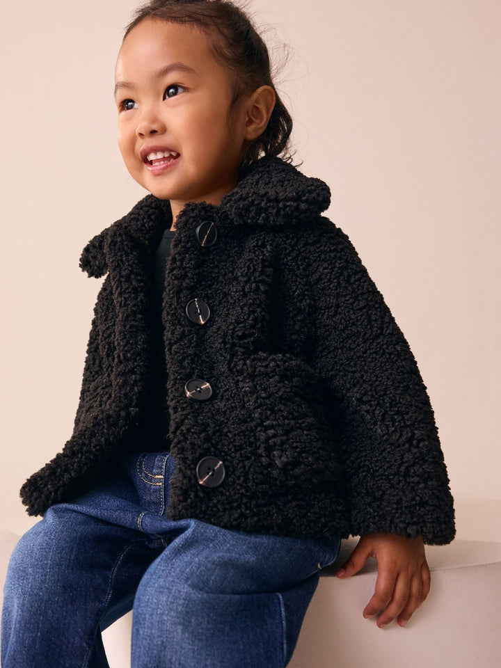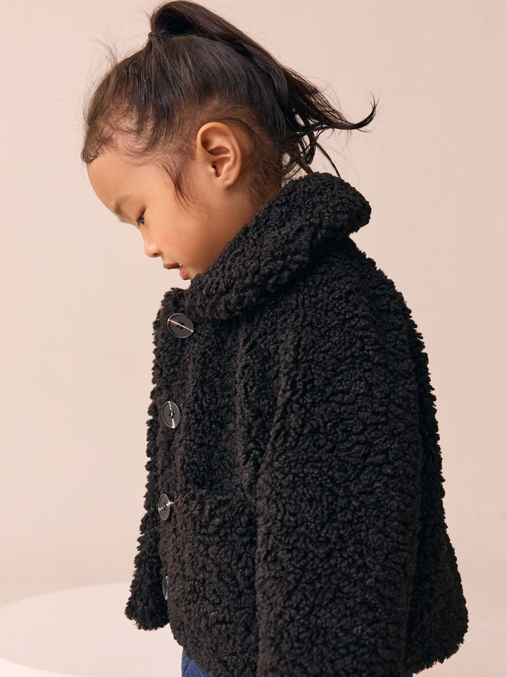 Stay warm and cosy in this black borg jacket, a fun and stylish choice for their everyday adventures. The soft, borg outer and classic jacket shape create a relaxed feel, while the full lining provides warmth on cooler days. With a button-front fastening and a collar, it's a versatile layering piece for the new season. Borg outer Fully lined Collar Button-front fastening Side pockets Machine washable. Main 100% Polyester. Lining 100% Recycled polyester. Country of Origin: China