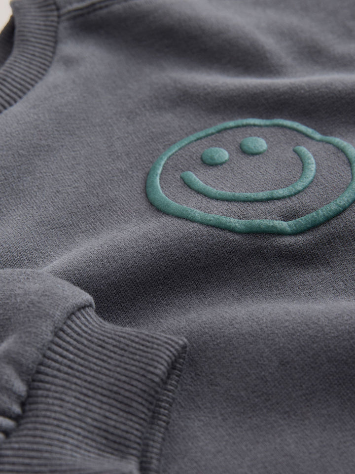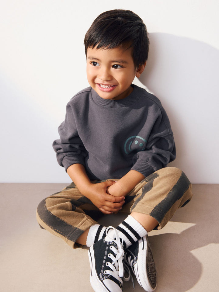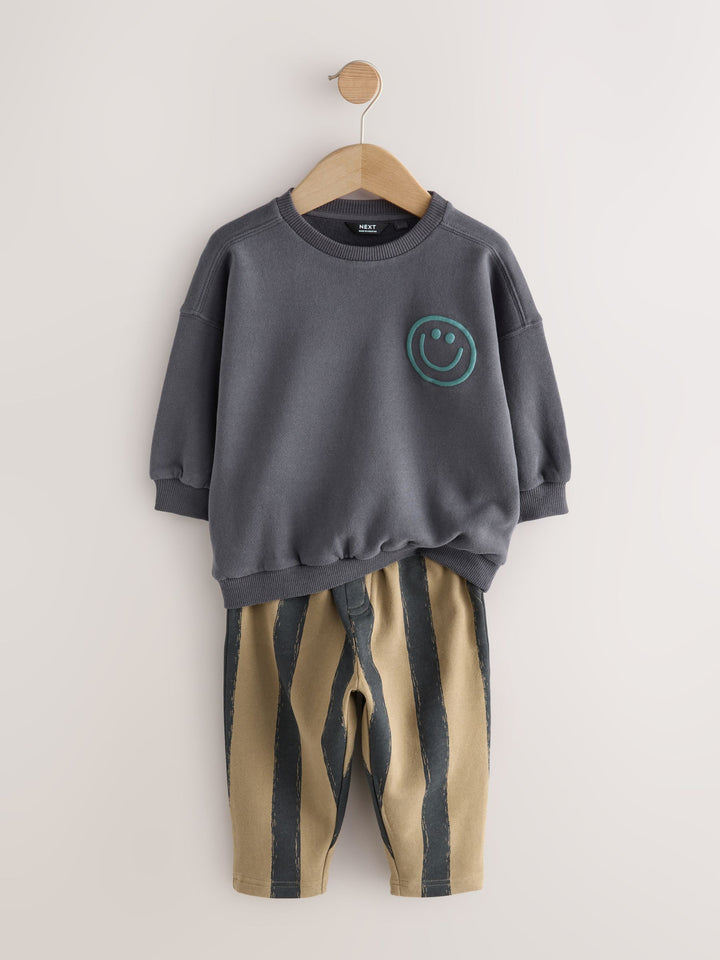 Our sweatshirt and stripes joggers set was made for having effortless styling. This two-piece set is made from breathable cotton and features a black sweatshirt and stripey printed joggers. Perfect for his outdoor adventures, add this to his rotation for a seamlessly stylish look. Two piece set 100% Cotton Sweatshirt with a smiley face Elasticated joggers Pockets Machine washable. Sweater 93% Cotton, 7% Recycled polyester. Jogger 100% Cotton. Country of Origin: Pakistan