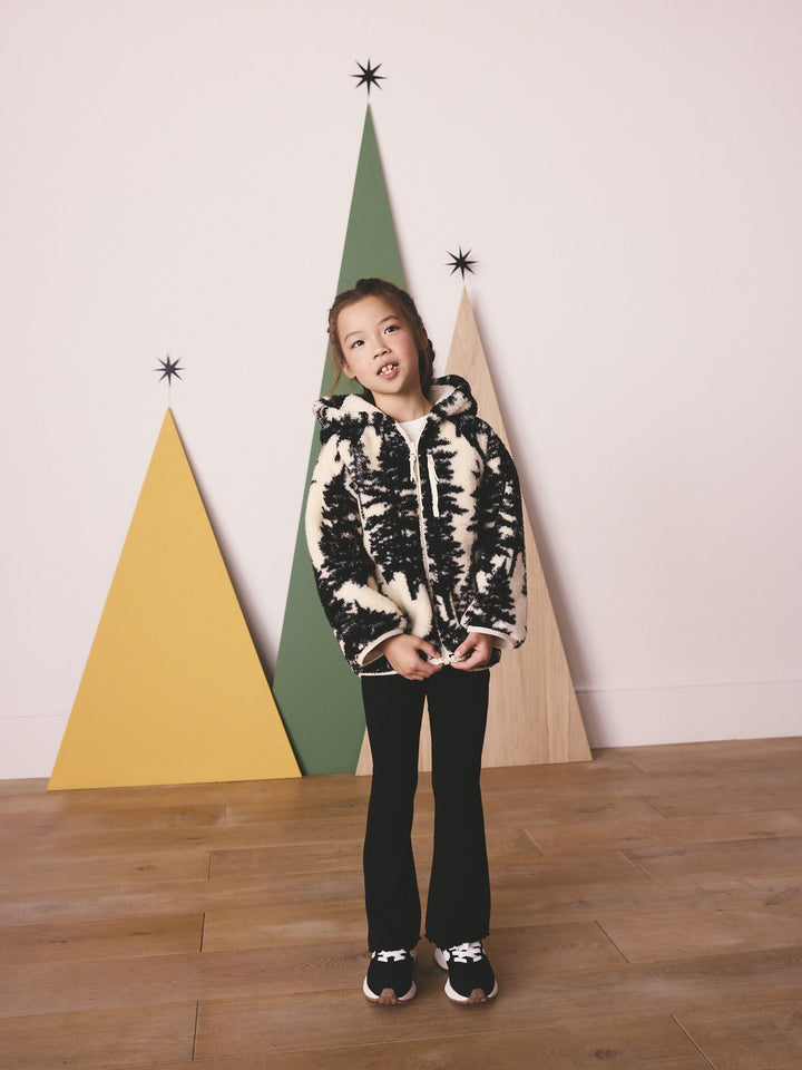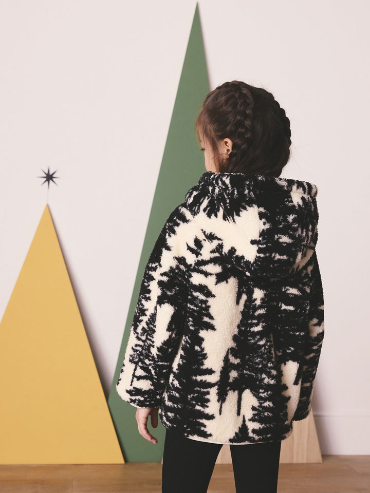 Discover this adventure-ready hooded zip borg fleece jacket! This children's borg fleece features a playful black and cream pine tree print and a comfortable half-zip neck. Made from super-soft, warm fabric, it’s the perfect trendy layer for winter fun and outdoor play. Matching family style Super soft and warm borg fabric High half-zip neck 100% Recycled polyester. Country of Origin: Cambodia