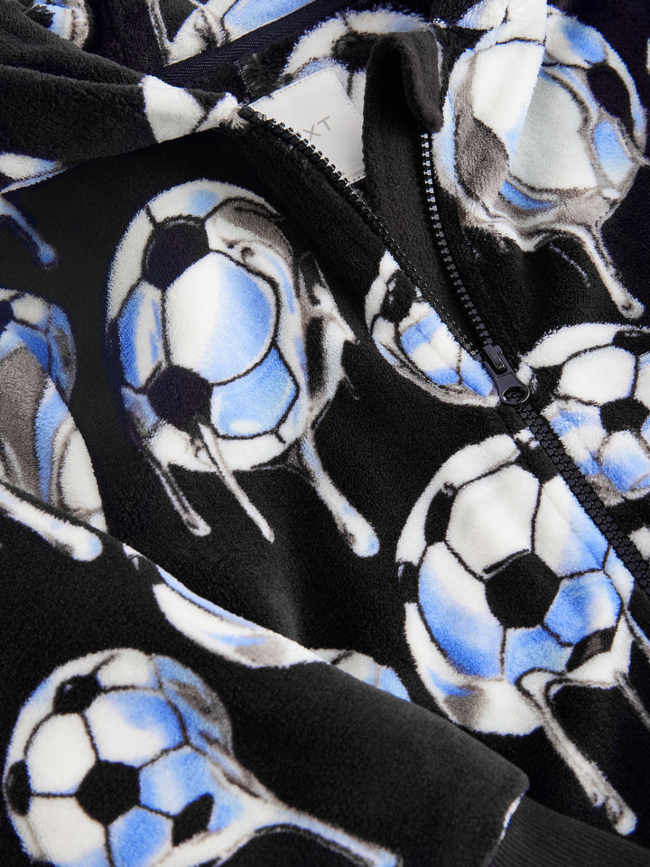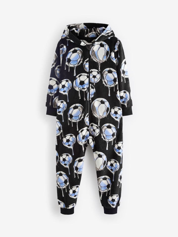 In a cosy fleece fabric, this black football print all-in-one is perfect for keeping warm at home, perfect for chilly mornings or evenings as an extra layer on top of their pyjamas. The all-in-one has a zippered fastening, a set-in hood and ribbed cuffs. Regular fit Fleece fabric Zip fastening Set-in hood Ribbed cuffs Machine washable. 75% Recycled polyester, 25% Polyester. Country of Origin: China Warning: Keep away from fire and flames.