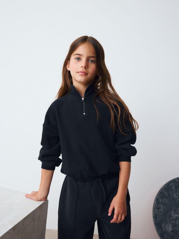 Black Long Sleeve Textured Zip Sweat Top (3-16yrs)