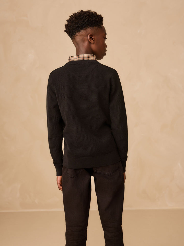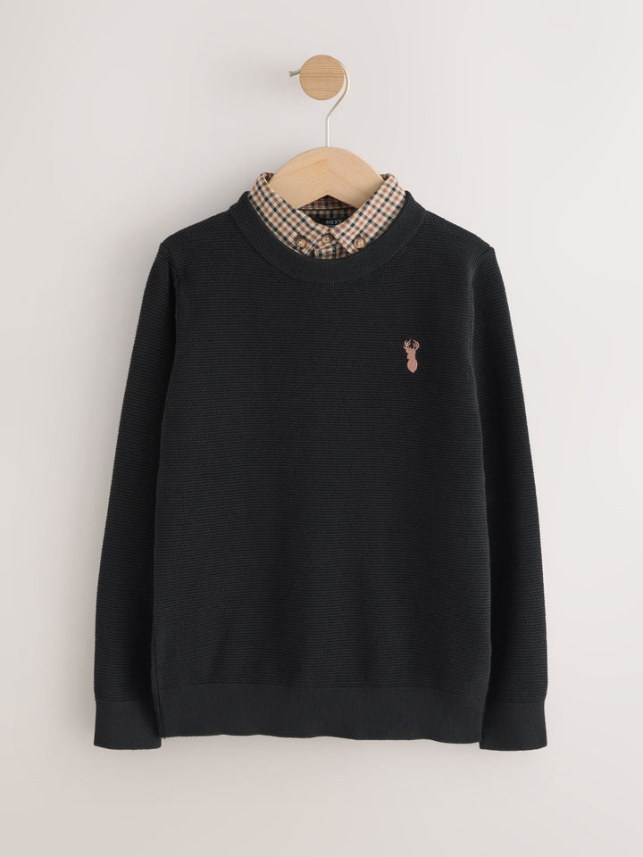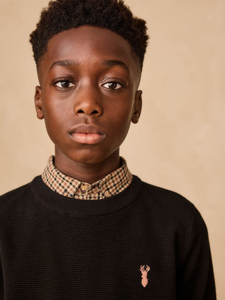 Showcase a smart, pre-layered look with this black crew neck jumper. The soft 100% cotton fabric provides a comfortable feel, while the mock gingham shirt collar and embroidered stag detailing on the chest add a touch of polished style. This versatile piece is perfect for a special occasion or a smart day at school.Knitted crew neck Mock shirt collar Stag embroidery on chest 100% cotton Long sleeves 100% Cotton. Country of Origin: Bangladesh