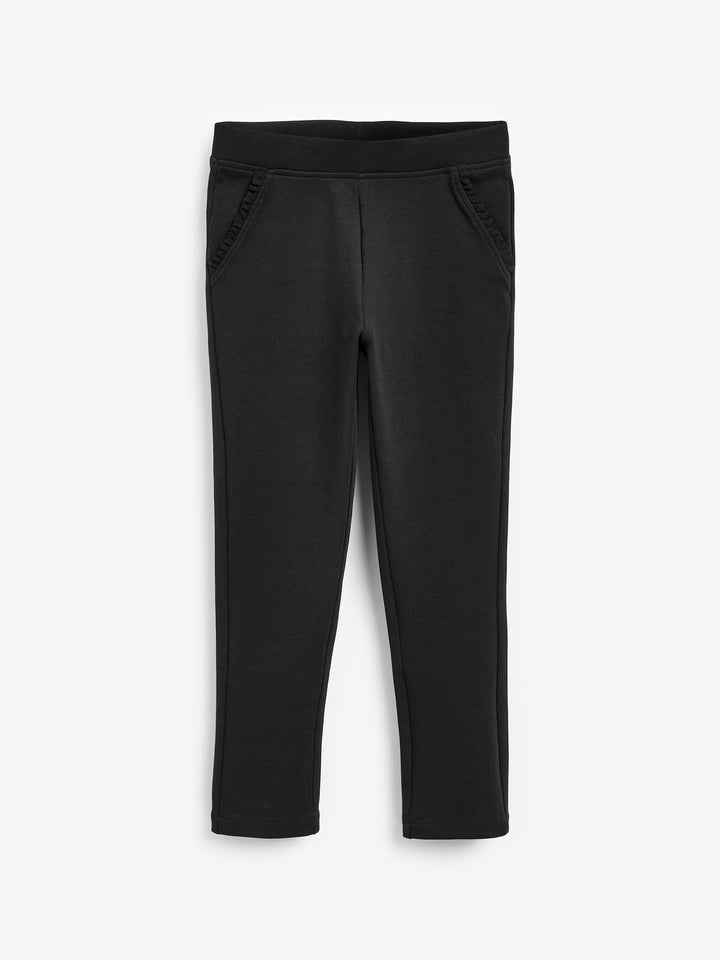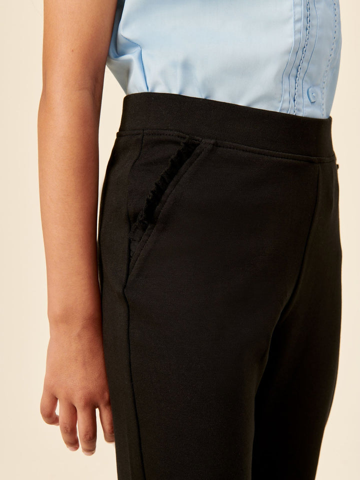 These black school trousers have an easy pull-on waistband, made from a comfortable stretchy fabric with frill detailing to the pocket, ideal to see them through their school days. Take the stress out of school mornings with our Dressing Made Easy School Uniform Collection. Featuring pull on trousers,skirts and dresses alongside hidden touch fastenings, printed labels and elasticated waists. Getting ready for school has never been easier.Key Features: Cotton Rich - Cotton rich blend for ultimate comfort and breathability. Pull-on style Frill detail Elasticated waist Mock pockets Machine washable. 96% Cotton, 4% Elastane. Country of Origin: Bangladesh