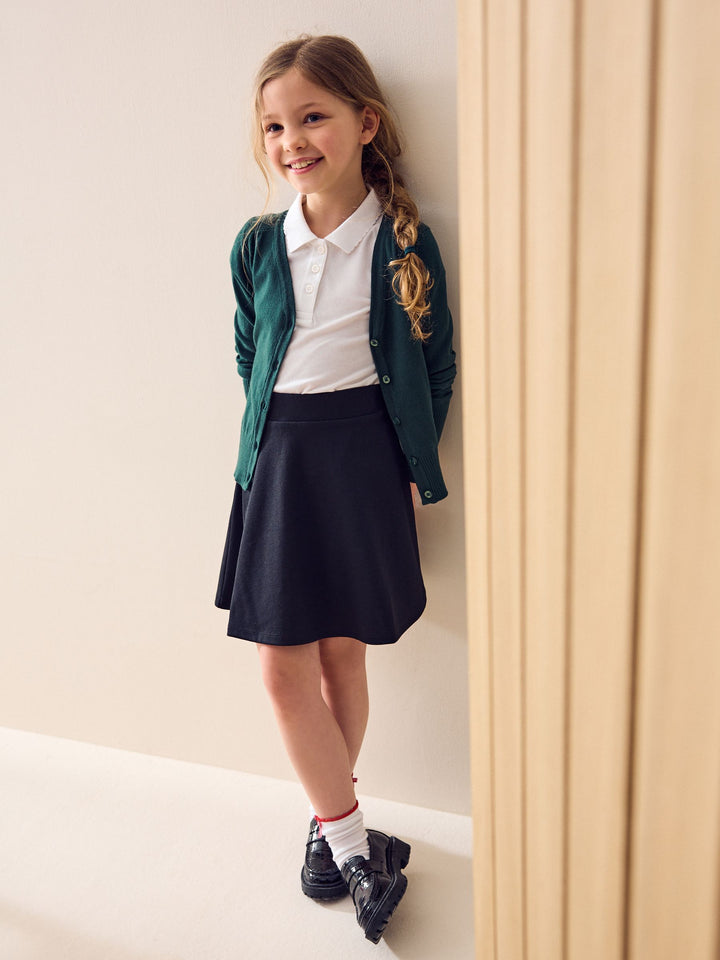 Take the stress out of school mornings with our Dressing Made Easy School Uniform Collection. Featuring pull-on trousers, skirts and dresses alongside hidden touch fastenings, printed labels and elasticated waists. Getting ready for school has never been easier.This black skater-style skirt is crafted from a soft jersey fabric and is designed in an easy pull-on style with an elasticated waistband for fuss-free mornings. Key Features: Skater style Stretch jersey Pull-on style Elasticated waist Machine washable Machine washable. 75% Recycled polyester, 22% Viscose, 3% Elastane. Country of Origin: Myanmar