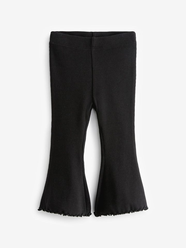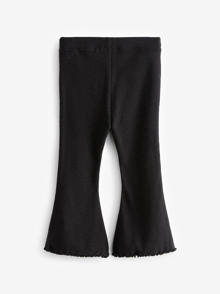 Level-up her everyday looks with our rib flare black leggings. Made from a cotton rich blend for added comfort and finely finished with lettuce trim edges, an elasticated waistband and ribbed detailing. Ribbed cotton stretch fabric Elasticated waistband Pull-On style Wide-leg shape Lettuce trim edges Machine washable. 95% Cotton, 5% Elastane. Country of Origin: Bangladesh