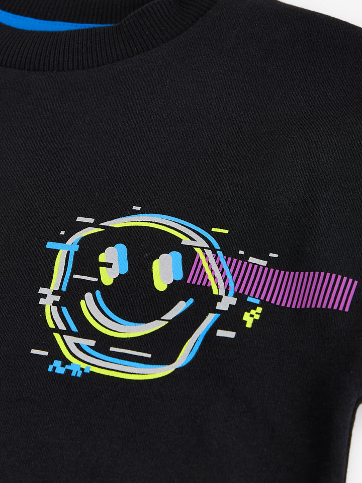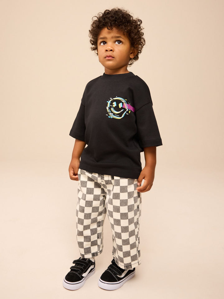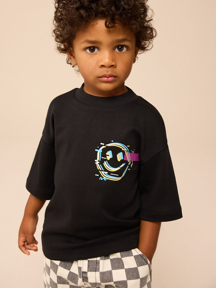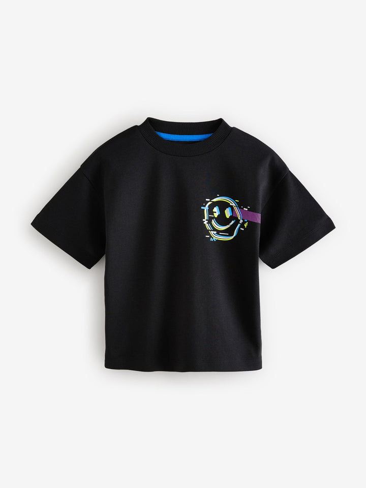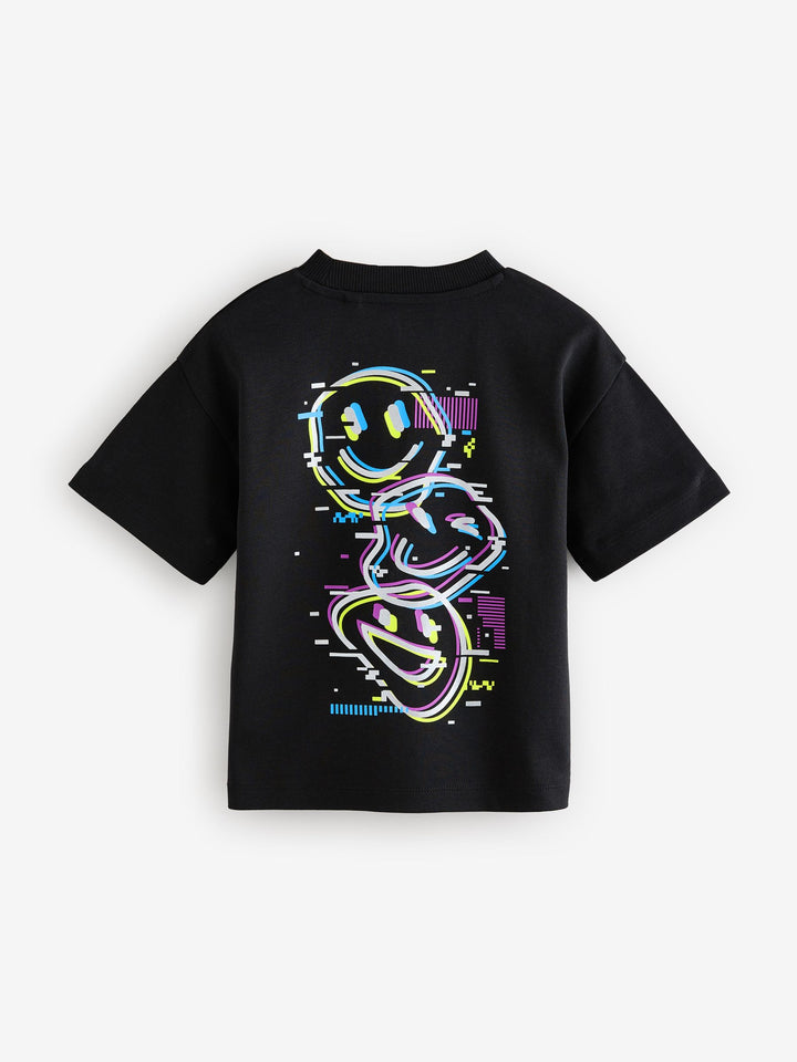 This stylish t-shirt features a smiley face chest and back print, set against a black pure cotton base with a ribbed crewneck collar. 100% cotton Crewneck collar Short sleeves Chest and back print Machine washable. 100% Cotton. Country of Origin: Bangladesh
