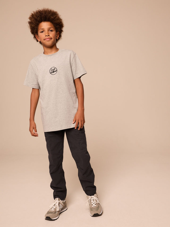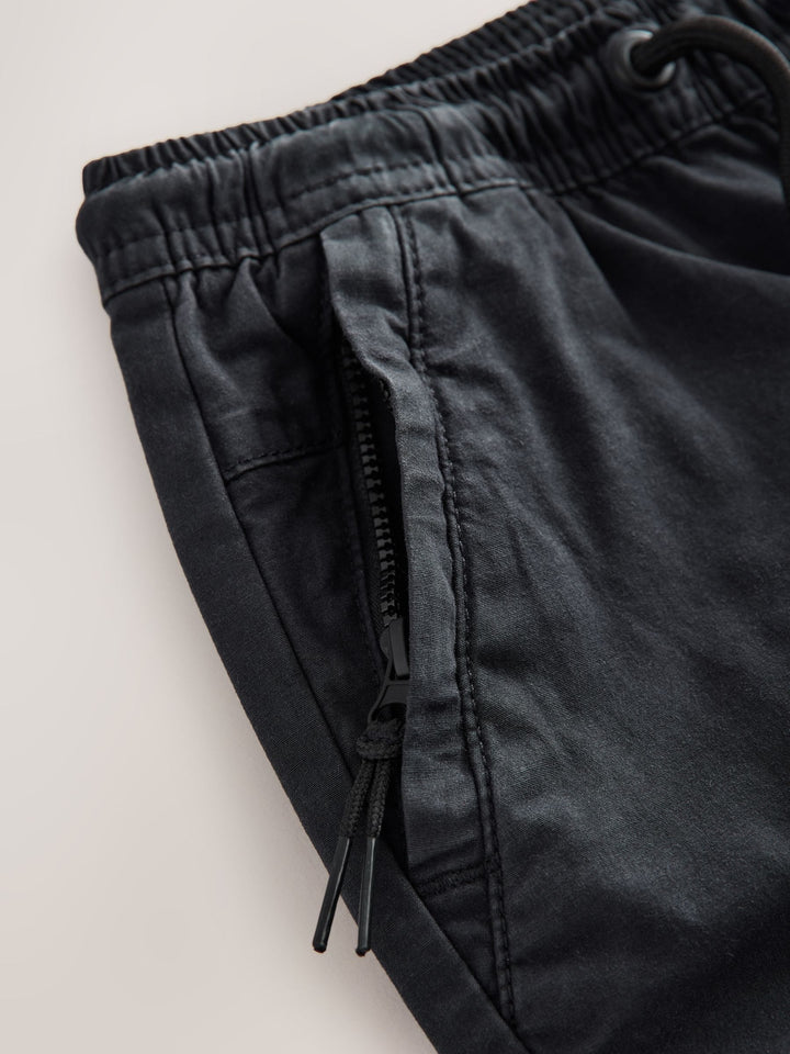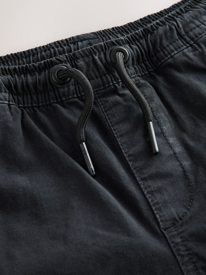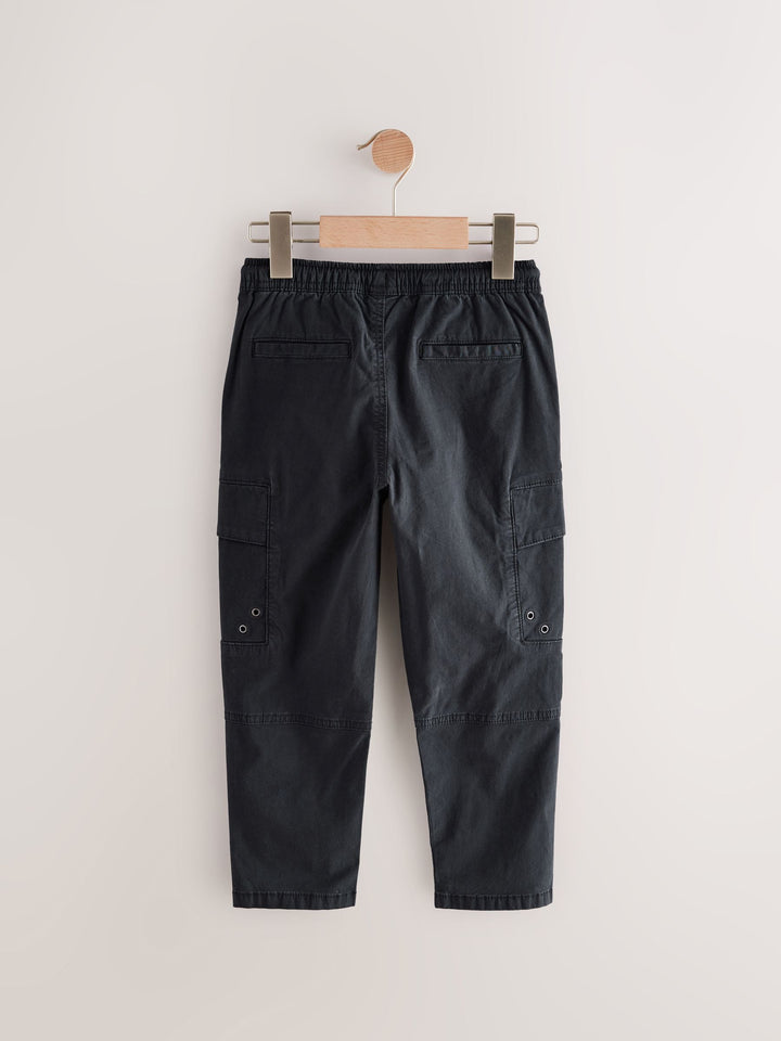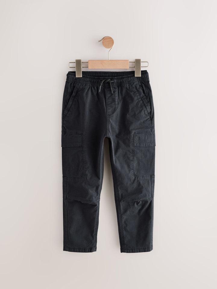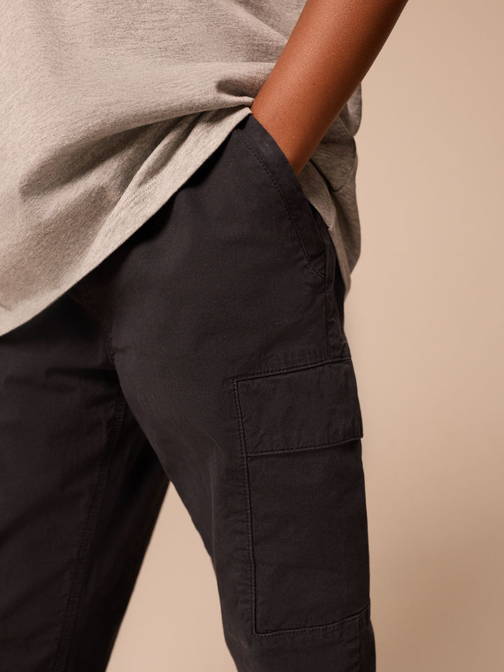 With an easy pull-on waist and a utility-inspired look, these stylish black trousers have a tapered leg shape that's perfect for showing off their trainers, with dual cargo pockets to the thighs and side pockets. Tapered leg Cotton-rich fabric Cargo pockets Side pockets Pull-on waist Machine washable. 97% Cotton, 3% Elastane. Country of Origin: Bangladesh