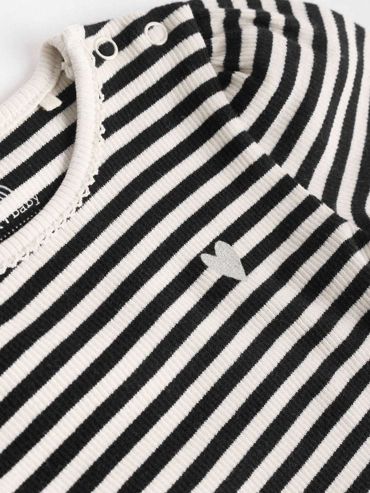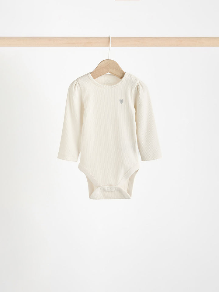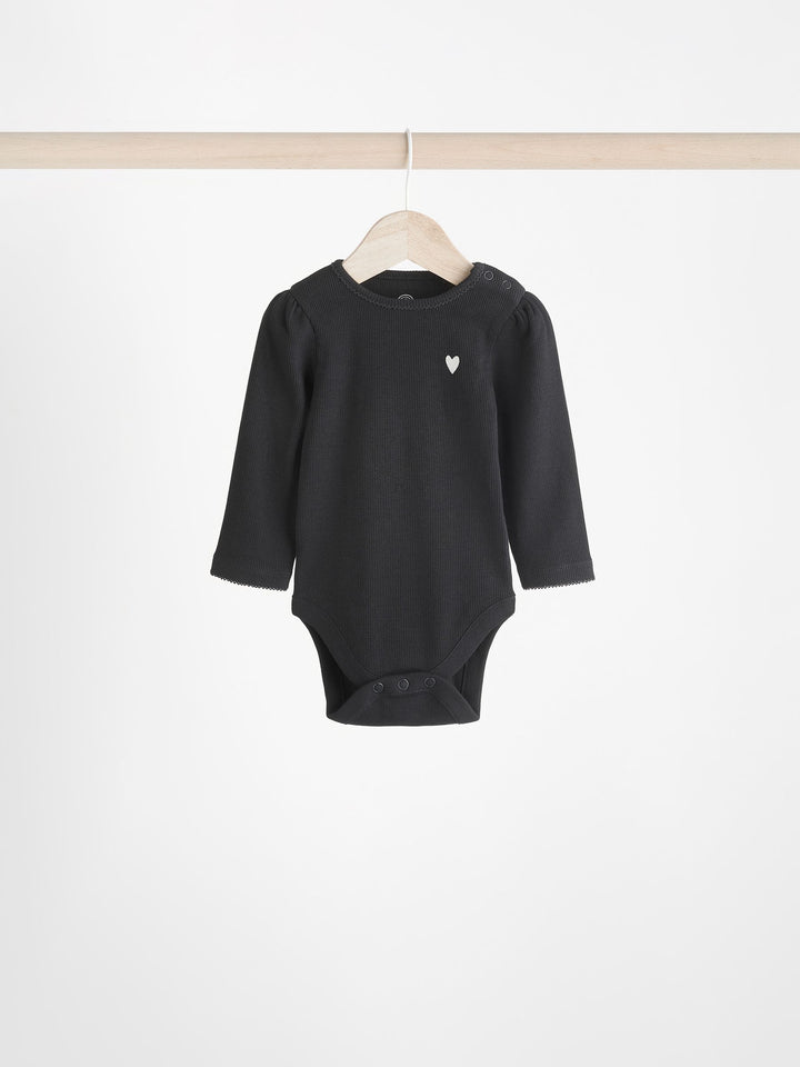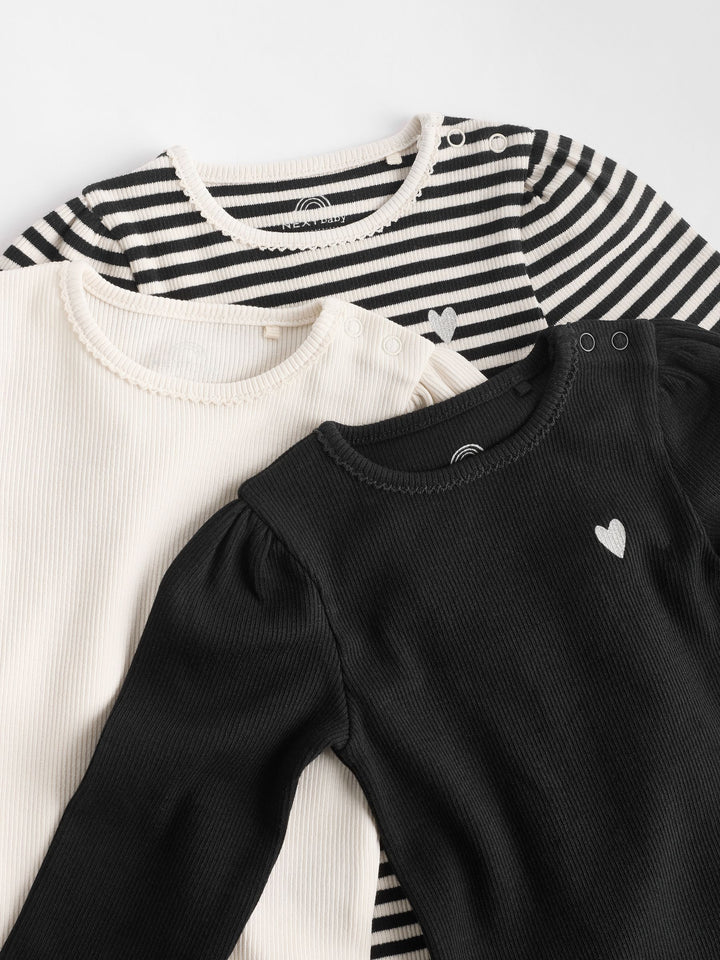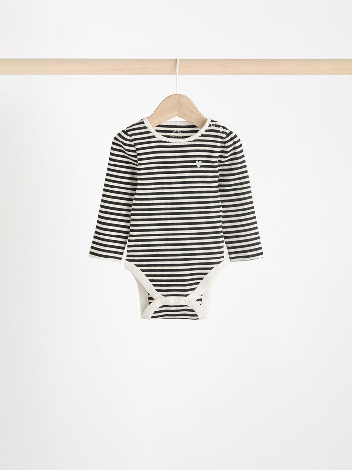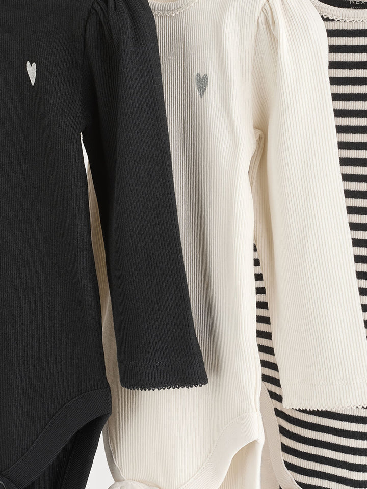 Stock up on baby must-haves, with this handy monochrome 3-pack of bodysuits, made from pure cotton with long sleeves, a popper crotch for easy changing and an envelope neck opening, finished in a happy heart print. 3-pack Popper crotch fastening Envelope neck Machine washable. 3 x Bodysuit 95% Cotton, 5% Elastane. Warning: Keep away from fire and flames.