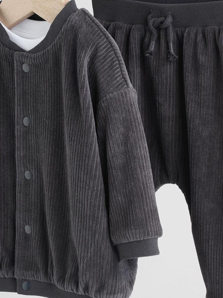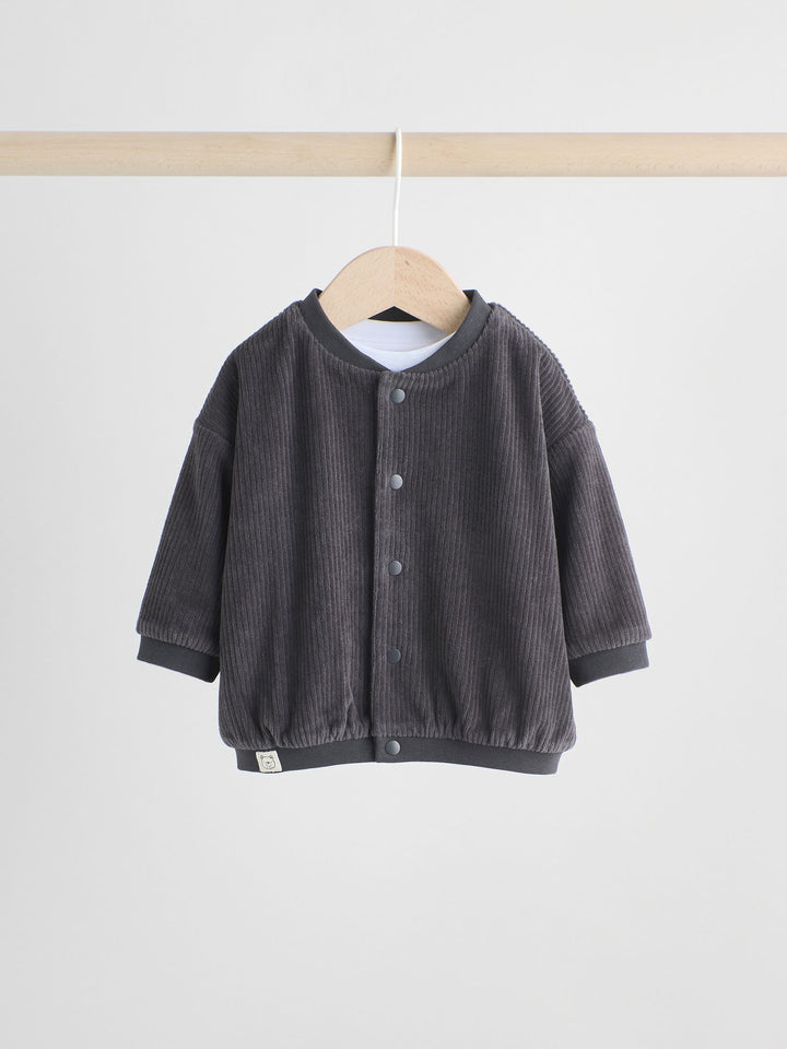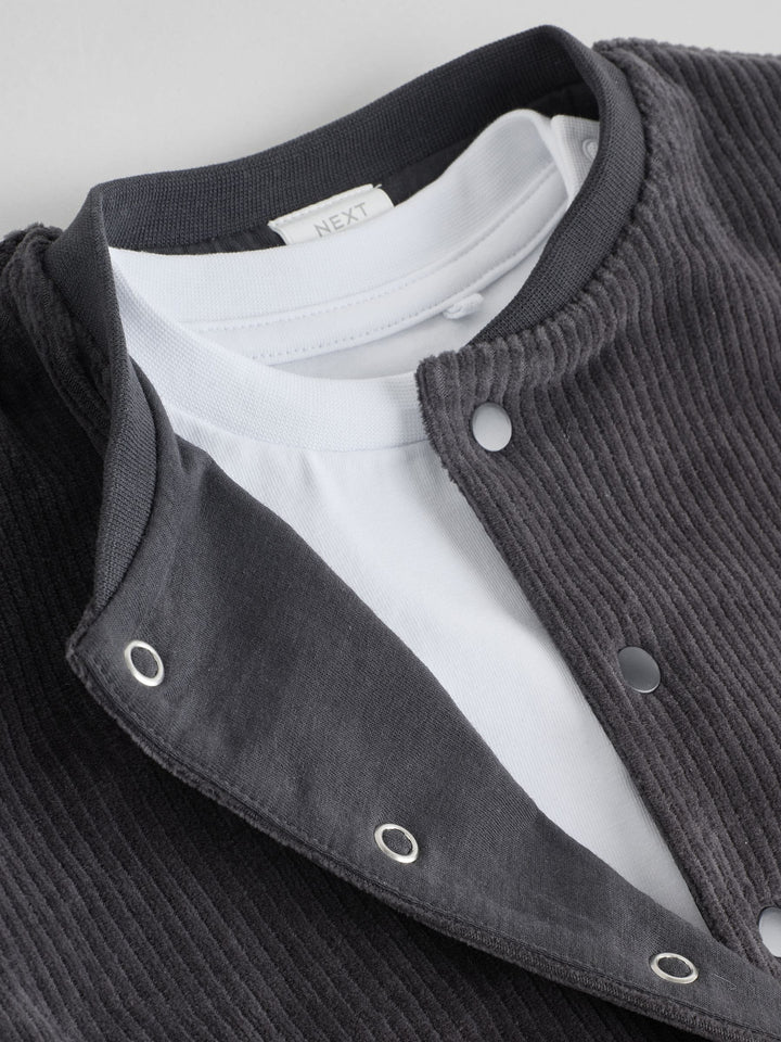 A complete and cosy outfit for their wardrobe, this 3-piece set is designed for comfort. The soft cotton blend t-shirt is perfectly paired with a cord bomber jacket and joggers, creating a stylish and effortlessly wearable look for any occasion. 3-piece set Soft cotton mix t-shirt Soft cord bomber style jacket Soft cord joggers Machine washable. Jacket and Jogger Main 70% Cotton, 28% Recycled polyester, 2% Elastane. Lining 100% Cotton. T-shirt 95% Cotton, 5% Elastane. Country of Origin: China Warning: Keep away from fire and flames.