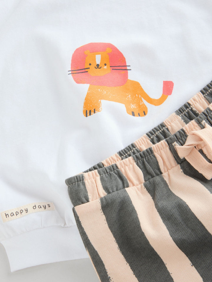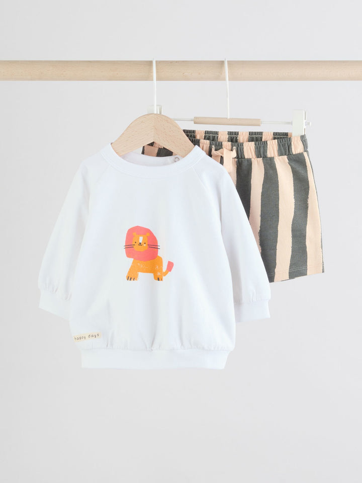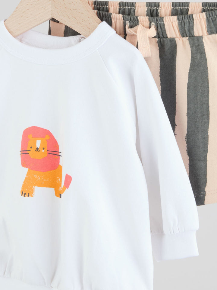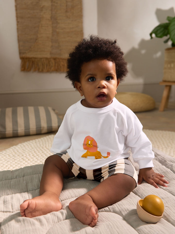Keep your little one looking cool and feeling comfy in this cool two piece long sleeve and short set. Featuring a fun lion characters sweatshirt, paired with cool vertical stripe shorts, this set is sure to keeps your little one on trend. Shorts have an elasticated waist for comfort. 2 piece set Long sleeve sweatshirt Elasticated shorts Cotton rich blend Machine washable. Jumper 92% Cotton, 8% Elastane. Shorts 100% Cotton. Country of Origin: Bangladesh Warning: Keep away from fire and flames.