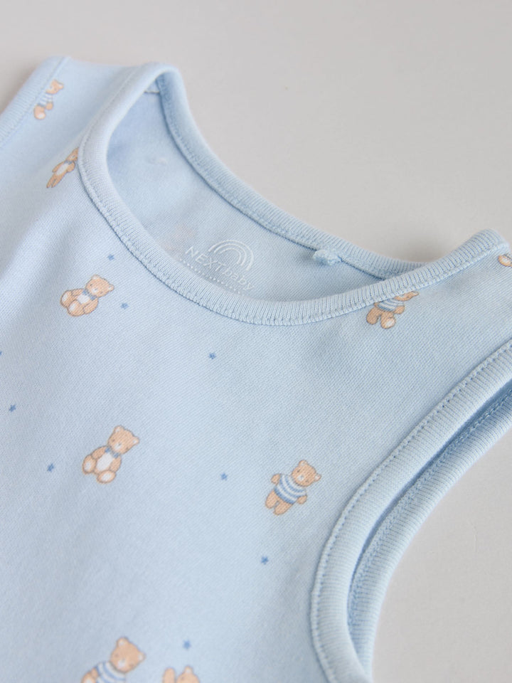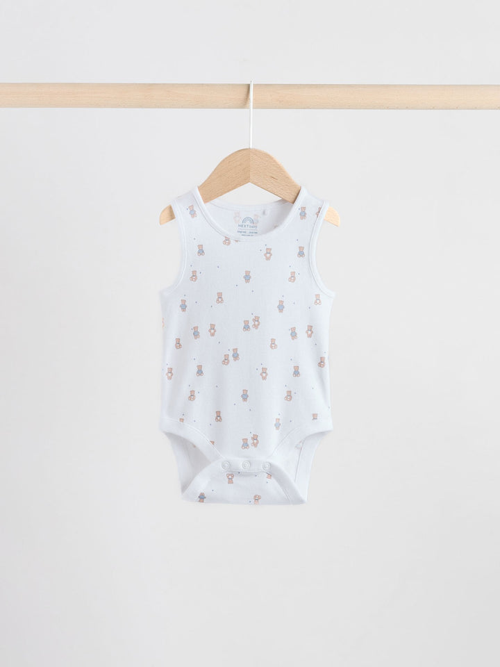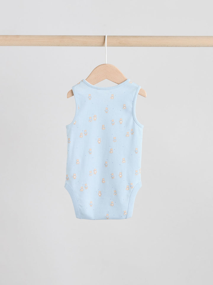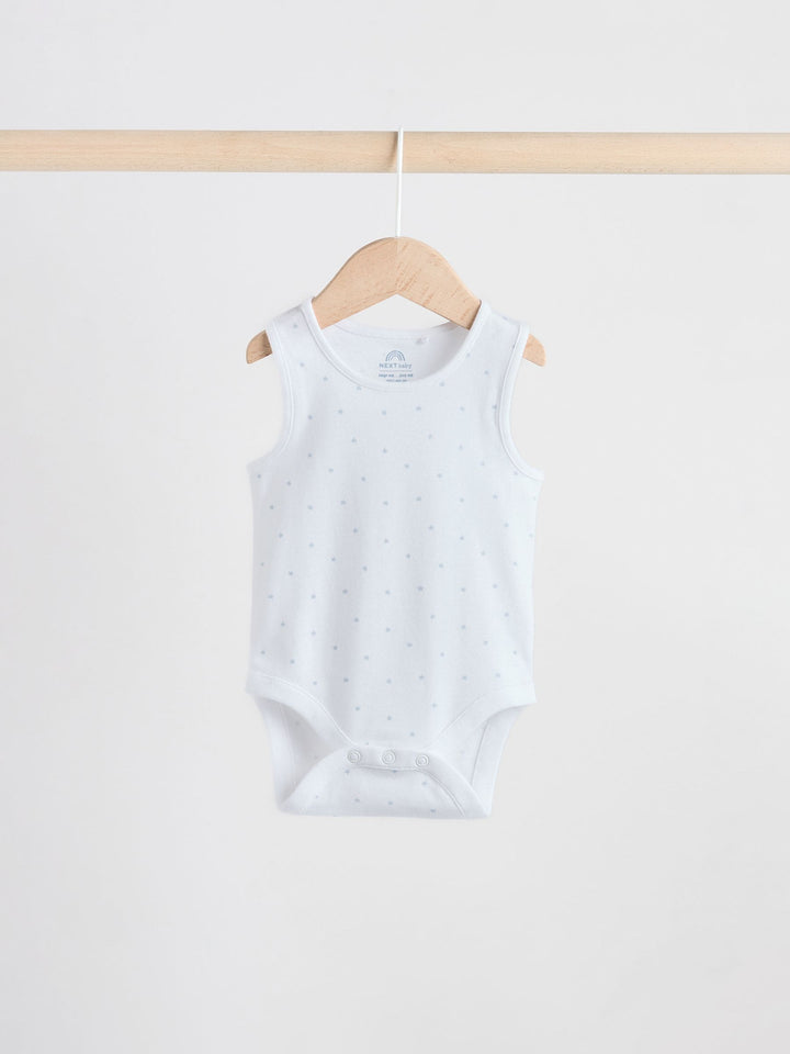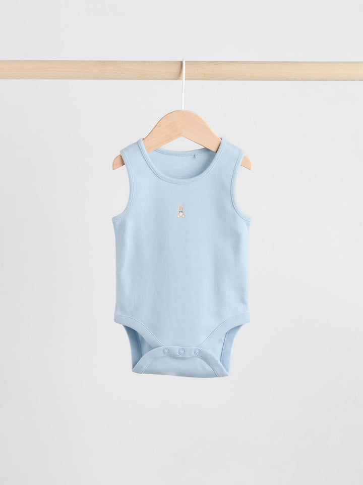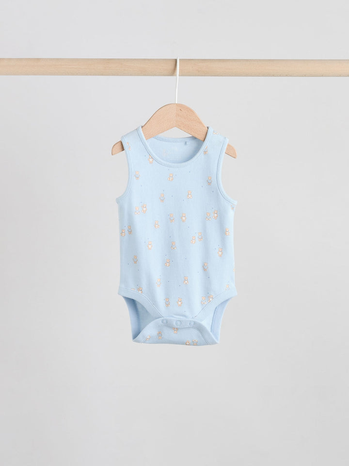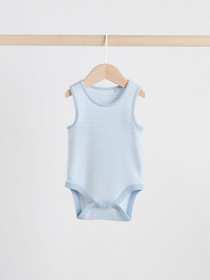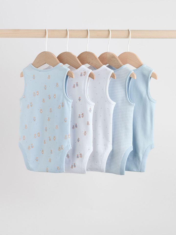 An essential foundation for the layette, this versatile Blue 5 Pack Vest Baby Bodysuits set offers excellent comfort and value. Crafted from Super Soft Cotton, these sleeveless bodysuits feature delicate prints and solid colours. Designed for ease, they include an Envelope Neck Opening and a Popper Bottom Fastening with Nickel free poppers to help protect against irritation to delicate skin. 5 Pack Bodysuits Super Soft Cotton Envelope Neck Opening Popper Bottom Fastening Nickel free poppers help to protect against irritation to delicate skin Machine washable. 5 x Bodysuit 100% Cotton. Country of Origin: India Warning: Keep away from fire and flames.
