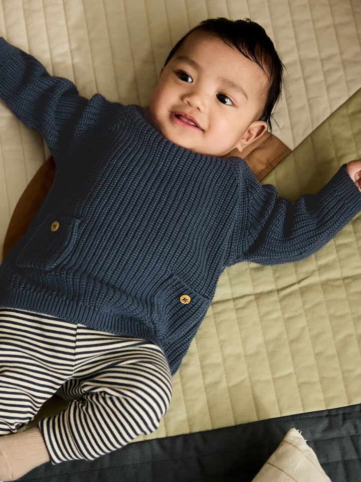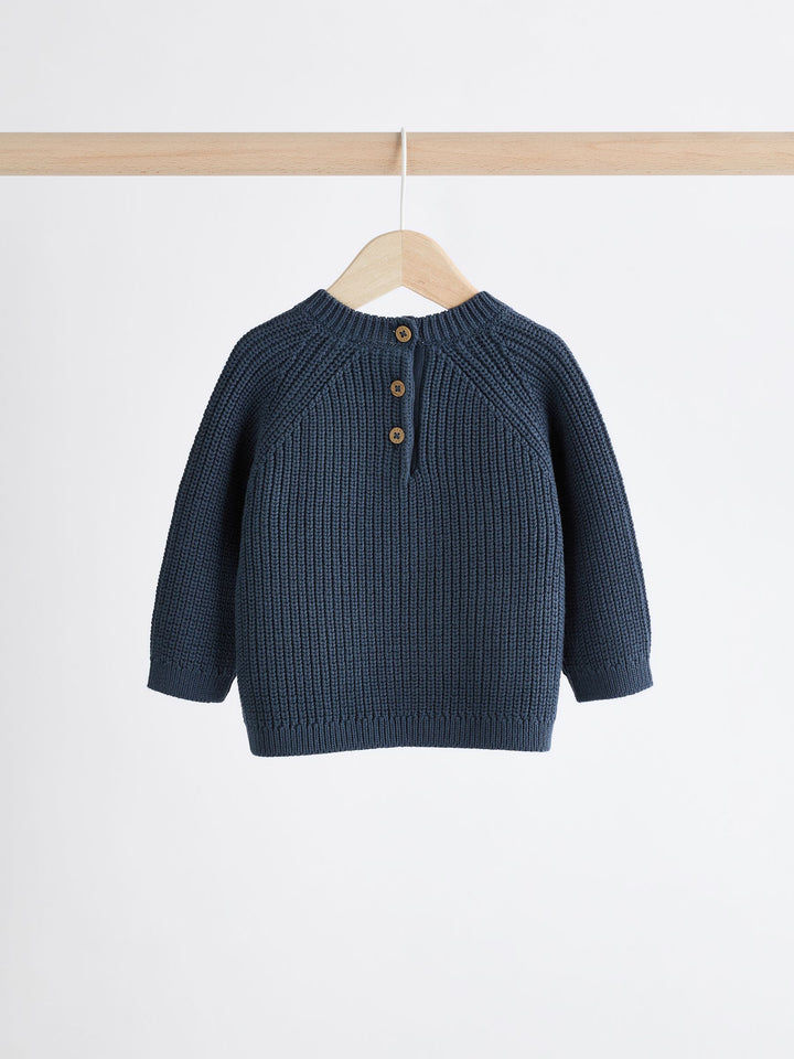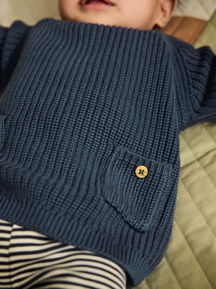 Keep your little one cosy in this charming blue two-piece knitted set. The long-sleeve jumper features a ribbed design and button fastening. The stretchy leggings, with an elasticated waistband and striped pattern, provide all-day comfort for your little one. 2-piece set Knitted Ribbed design Elasticated waistband Button fastening Long sleeve Machine washable. Sweater 100% Cotton. Leggings 95% Cotton, 5% Elastane. Country of Origin: Bangladesh Warning: Keep away from fire and flames.