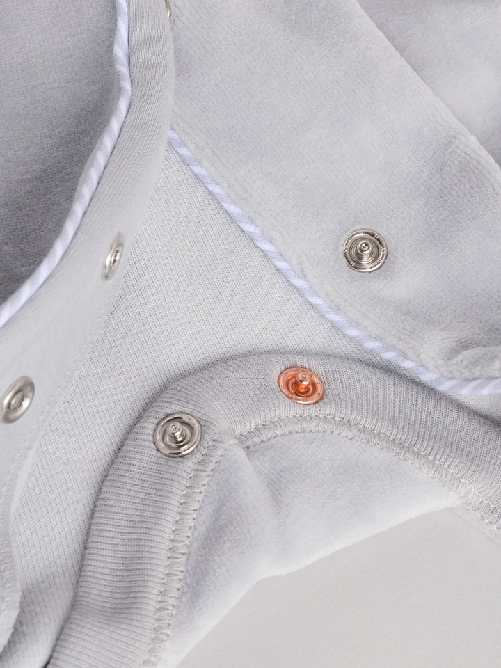 Footed sleepsuit Dinosaur embroidery Super soft velour fabric Patch pocket Long sleeves Crew neck Nickle-free popper fastenings Machine washable. 85% Cotton, 15% Polyester. Country of Origin: India Warning: Keep away from fire and flames.