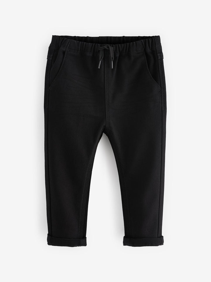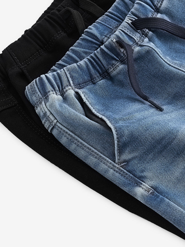 With an easy pull-on design, this black and blue 2-pack of pull-on jeans are made from a stretchy cotton-blend denim with an adjustable drawstring, side pockets and turn-up cuffs. 2-pack Cotton-blend Pull-on design Elasticated waistband Blue and black pair Side pockets Adjustable drawstring Trouser Black 66% Cotton, 33% Recycled polyester, 1% Elastane. Trouser Blue 62% Cotton, 36% Recycled polyester, 2% Elastane. Country of Origin: Cambodia