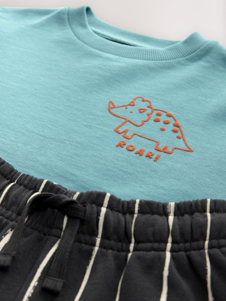 Including: Striped shorts puff print dino on the chest Machine washable. Sweater and Shorts 100% Cotton. Country of Origin: Bangladesh