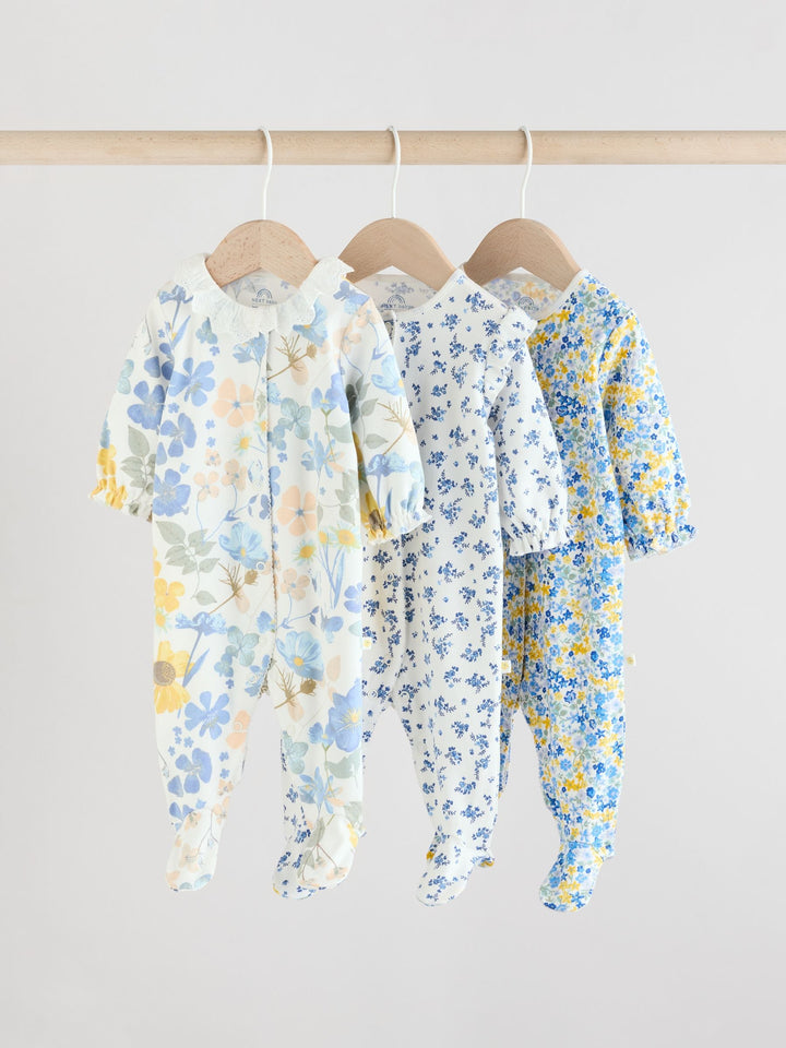 Our 3 pack of baby sleepsuits make charming addition to their collection. Featuring an array of pretty floral prints, they're complete with popper fastening, long sleeves and frill detailing. 3 pack 100% cotton Popper fastening Floral print Long sleeves Machine washable. 3 x Sleepsuit 100% Cotton. Country of Origin: Sri Lanka Warning: Keep away from fire and flames.