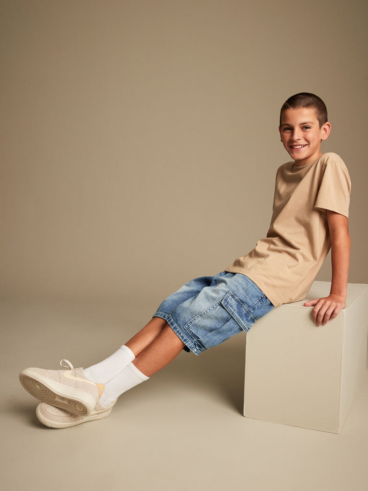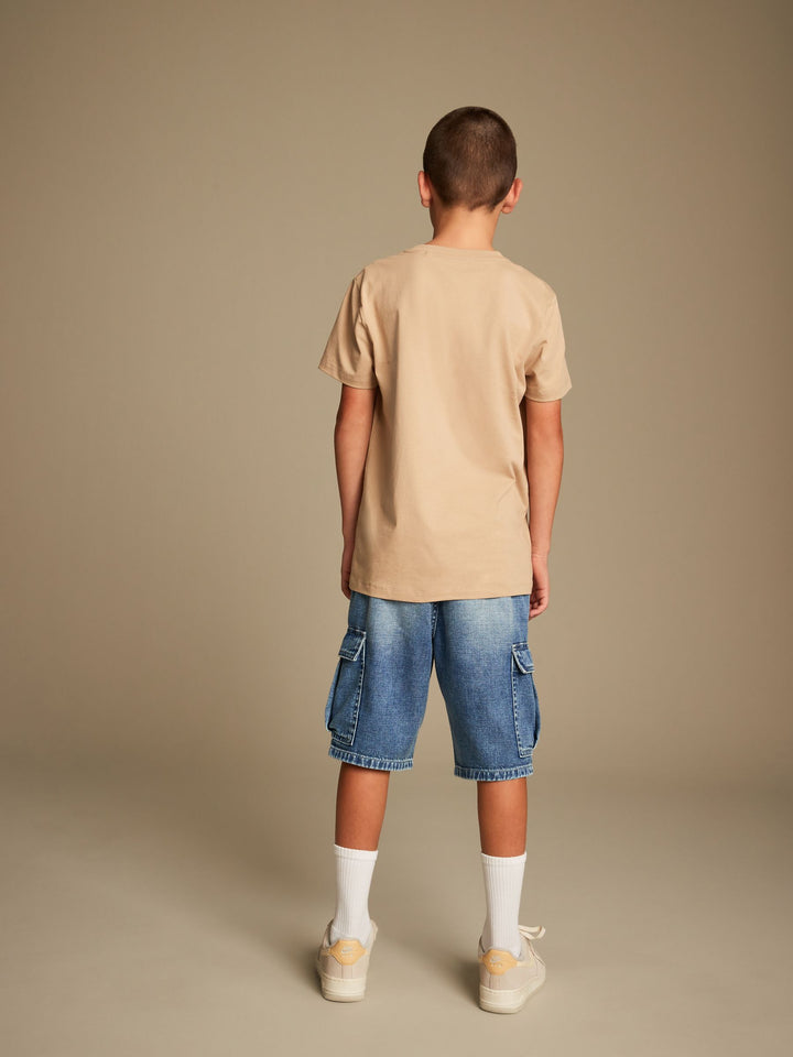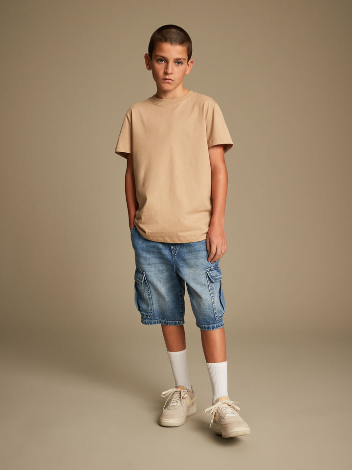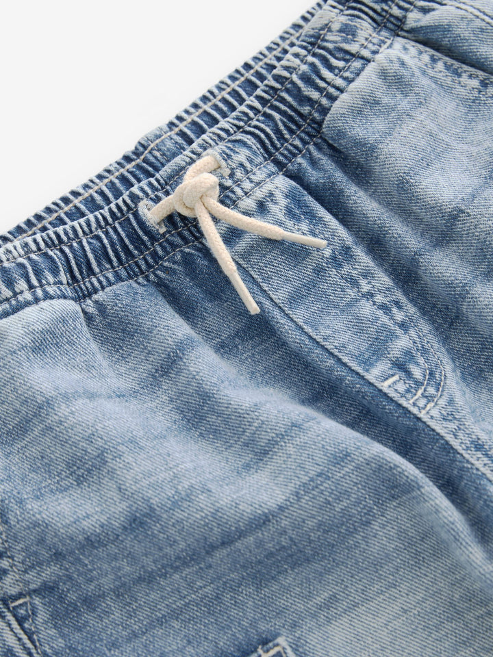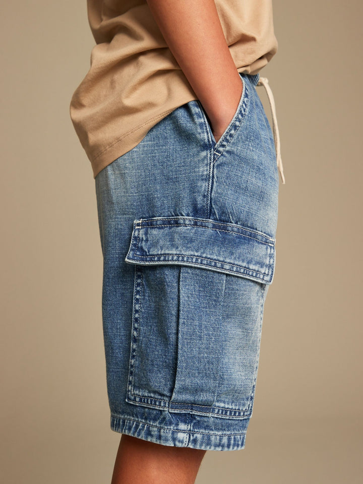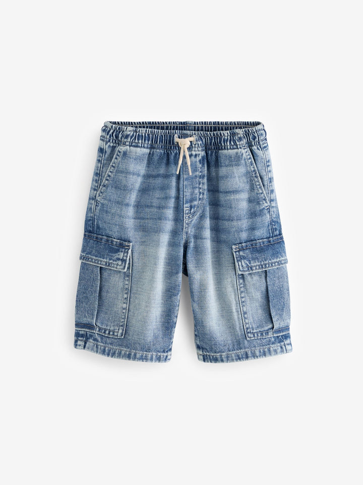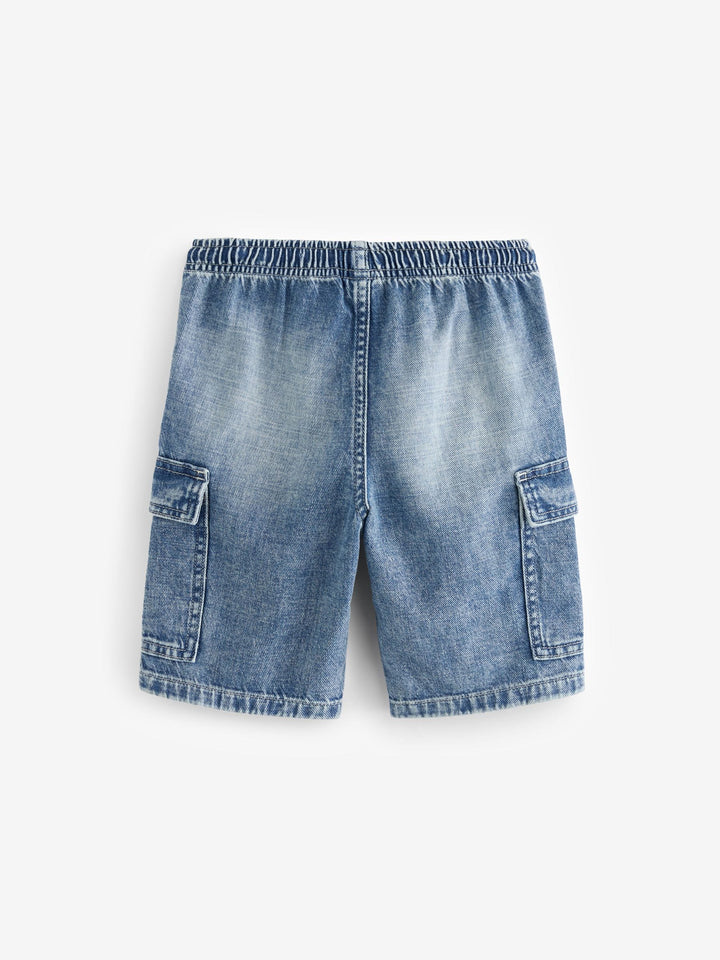 Perfect for summer adventures, these blue pure-cotton denim shorts have a knee-length design with cargo pockets to the thighs, finished with an adjustable pull-on waist, dual side pockets and dual rear pockets. Regular fit Pull-on waist Cargo pockets Dual side pockets Dual rear pockets Machine washable. 100% Cotton. Country of Origin: Bangladesh