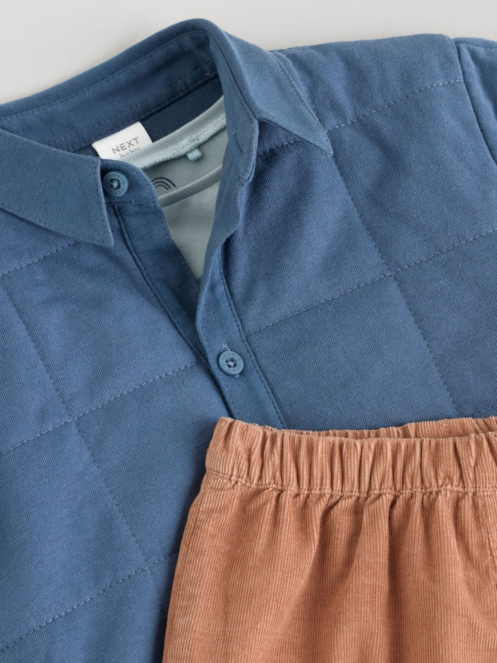 This 3-piece set is made up of a soft cotton mix T-Shirt with a cute dino all-over print and cord trousers. Paired with a soft quilted jacket. Machine washable. Jacket Main 100% Cotton. Lining 100% Cotton. Sleeve Lining 100% Recycled polyester. Wadding 100% Recycled polyester. T-shirt 95% Cotton, 5% Elastane. Trouser 100% Cotton. Country of Origin: Sri Lanka Warning: Keep away from fire and flames.