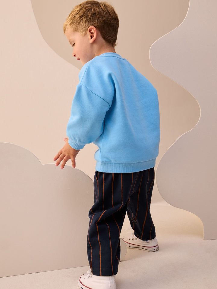 Our sweatshirt and stripes joggers set was made for having effortless styling. This two-piece set is made from breathable cotton and features a black sweatshirt and stripey printed joggers. Perfect for his outdoor adventures, add this to his rotation for a seamlessly stylish look. Two piece set 100% Cotton Sweatshirt with a smiley face Elasticated joggers Pockets Machine washable. Sweater and Jogger 80% Cotton, 20% Recycled polyester. Country of Origin: Bangladesh