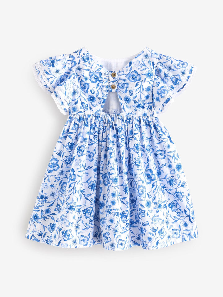 With gorgeous angel sleeve detailing, this pretty blue floral dress is made from pure cotton for a comfortable feel, lace detailing to the trim and a button fastening to the back with cut-out detailing. 100% cotton Angel sleeve Lace detailing Button fastening Cut-out detailing Main 100% Cotton. Lining 100% Cotton. Country of Origin: India